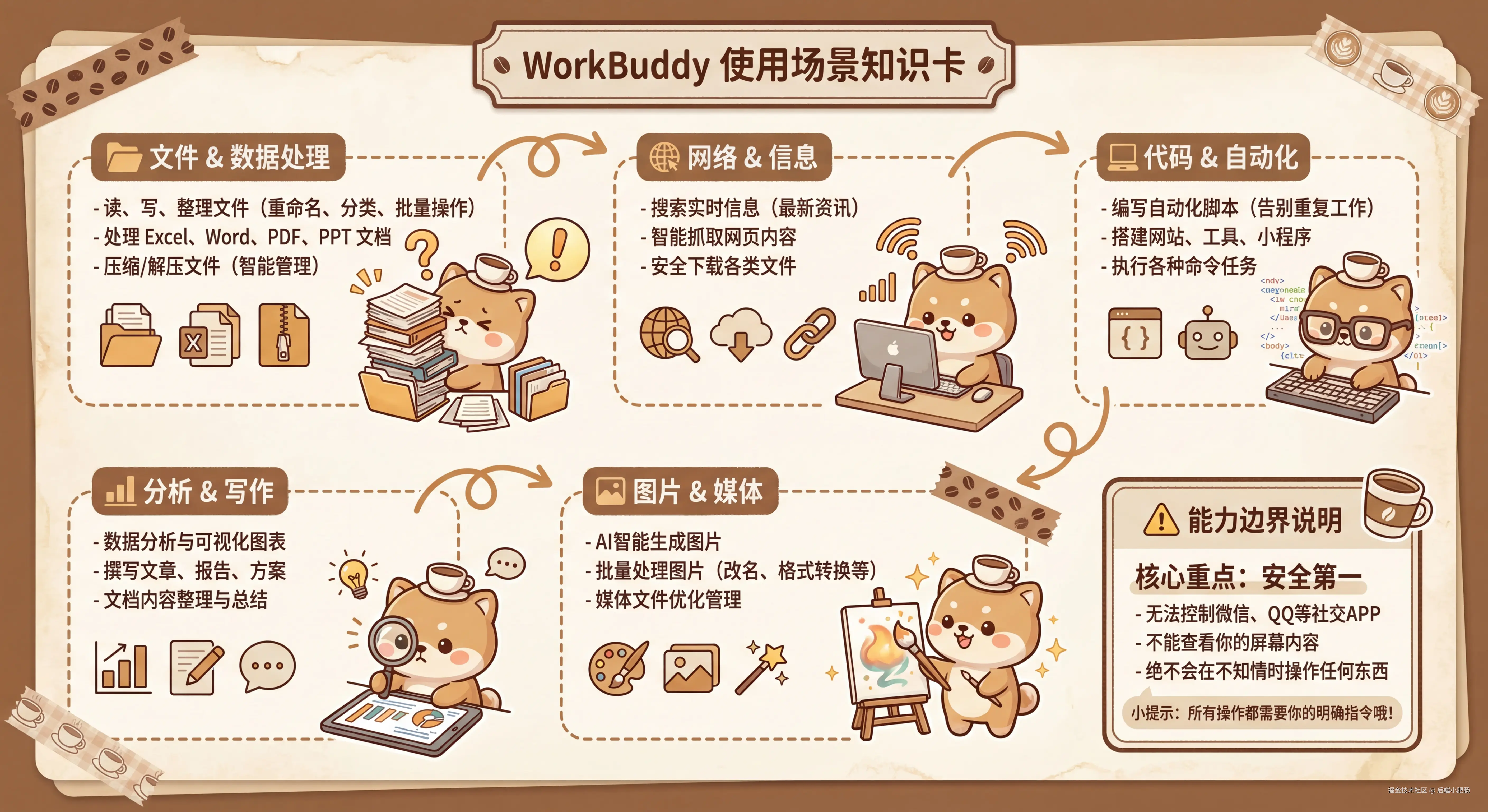 WorkBuddy 就像一个极其听话的全能数字助理。在核心能力上,它能帮你批量重命名、分类整理文件,搞定 Excel、Word、PDF 等各种文档和压缩包,还能直接联网搜索信息、获取网页数据和下载资料。遇到繁琐的重复性工作,它可以直接帮你敲代码写脚本、跑命令甚至搭建小程序。