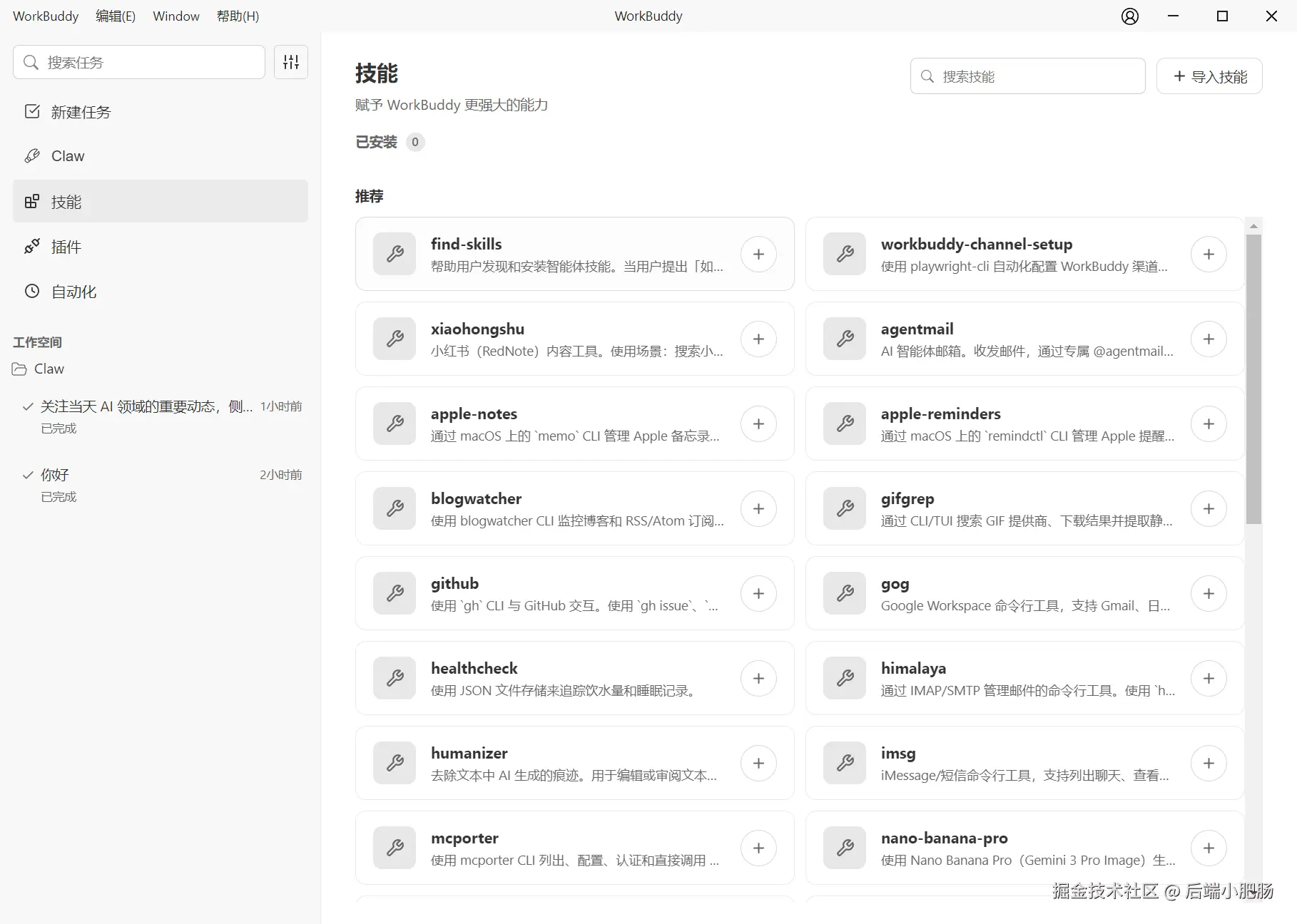 可一键安装热门skill,导入自定义skill。