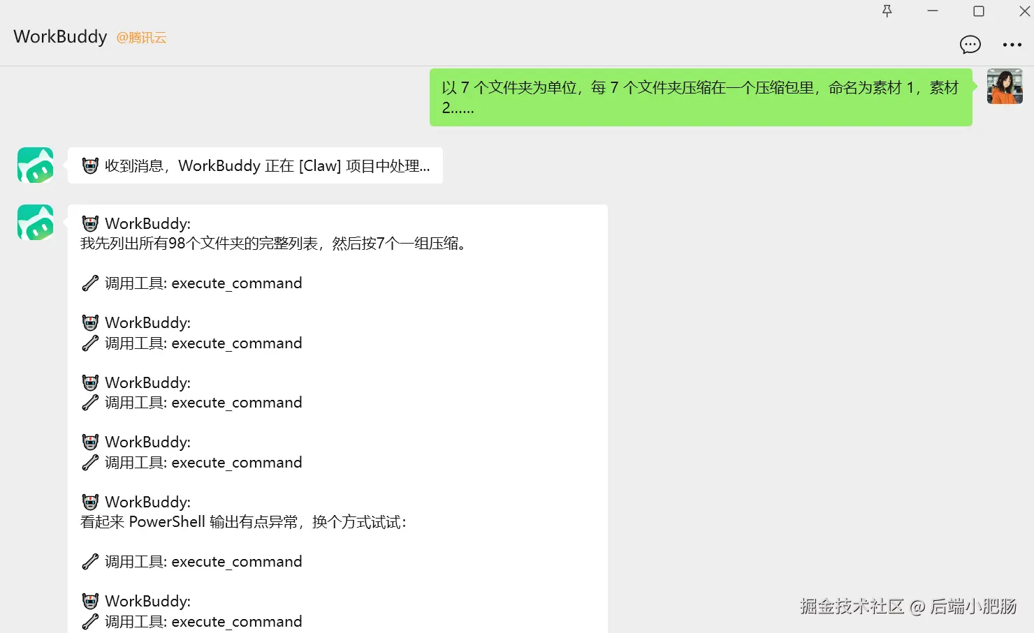 我与小龙虾对话,让它将D盘里的文件以7个为一组压缩为压缩包,输入的命令:以 7 个文件夹为单位,每 7 个文件夹压缩在一个压缩包里,命名为素材 1,素材 2……