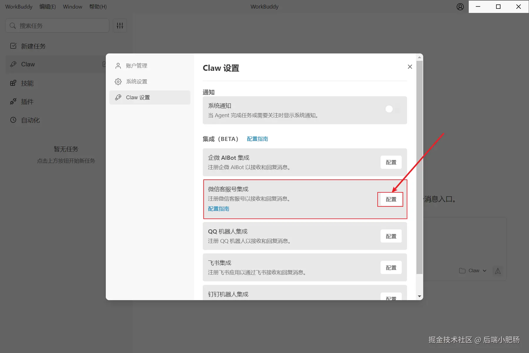 在弹出的【Claw设置】弹窗中点击【微信客服号集成】—【配置】按钮。