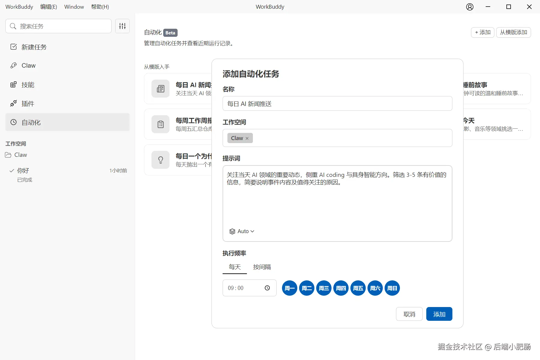 在弹出的【添加自动化任务】弹窗中,设置定时任务的细节,包括名称、工作空间、提示词、执行频率。这边我用的默认参数,点击【添加】按钮。