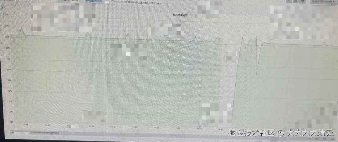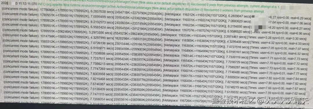 查看Flink作业后台进程,发现JM隔一会就会自动重启,TM进程一直未启动。查看JM启动日志发现每次都是因为Java heap space堆内存溢出导致Flink容错机制自动重启,查看JM的GC日志,日志中大量出现 concurrent mode failure,表明并发 GC 已无法跟上内存分配速度。 查看JM的堆内存监控,堆内存在 1 分钟内占比快速攀升接近至100%,即便配置 8G process内存,GC 也无法有效回收,几分钟内触发 OutOfMemoryError。