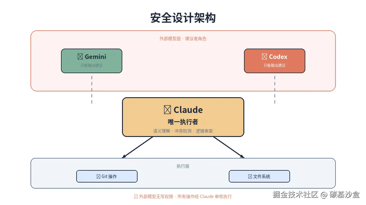 外部模型被严格限制为建议者角色,它们只能输出统一格式的代码补丁,这些补丁通常是git diff 风格的文本,外部模型不能执行任何写的操作,像git add/commit 。所有写的操作都在claude,它负责语义理解和冲突检测、逻辑审查。