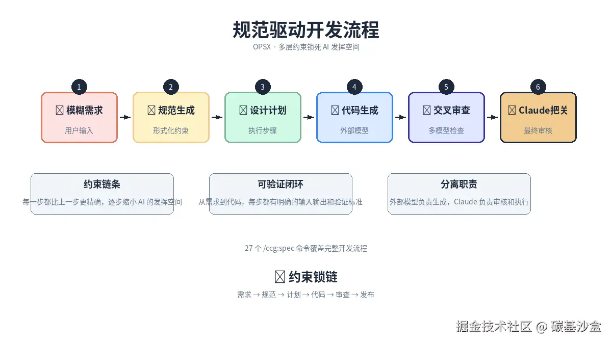 该项目集成OPSX,这是另一个开源工具,它专门为Ai编码设计规范,ccg-workflow把 OPSX 封装成更易用的 /ccg:spec系列命令,一共有27个,通过从模糊需求给claude生成形式化的约束到设计计划、执行代码生成、双模型交叉审查,每项步骤的文件存放位置,然后claude最终审查把关都设计的很好,这个设计就是通过多层约束 + 分离职责 + 可验证闭环 来锁死 AI 的发挥空间