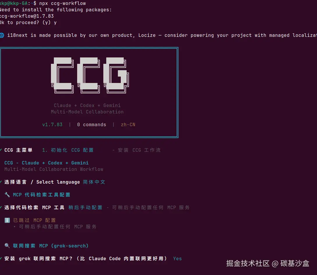 安装好后要初始花CCG配置,选择语言和代码检索MCP工具,以及可以配置grok联网检索,grok这个联网检索的功能真的很强大,这个项目里集成这个真的是优点。