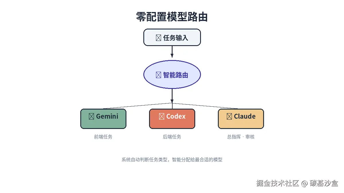 在日常开发中,你不用自己决定或手动告诉系统这次用哪个模型,系统会根据任务的性质主要是前端 vs 后端自动、智能地分配给最合适的模型,默认是Gemini负责前端,Codex负责后端,而 Claude 始终扮演总指挥 + 最终审核者的角色。