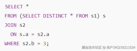 Select * from (select distinct * from s3) s3, s1 where s1.s1a = s3.s3a;