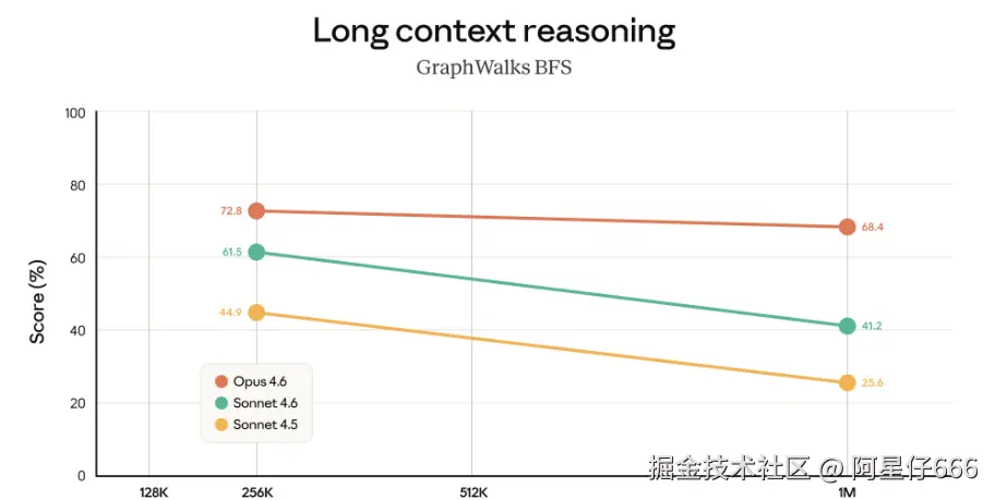 第二个叫 GraphWalks BFS,考的是长上下文逻辑推理,结果是 Opus 4.6 得 68.4%,而上一代的 Sonnet 4.5 只拿了 25.6%。