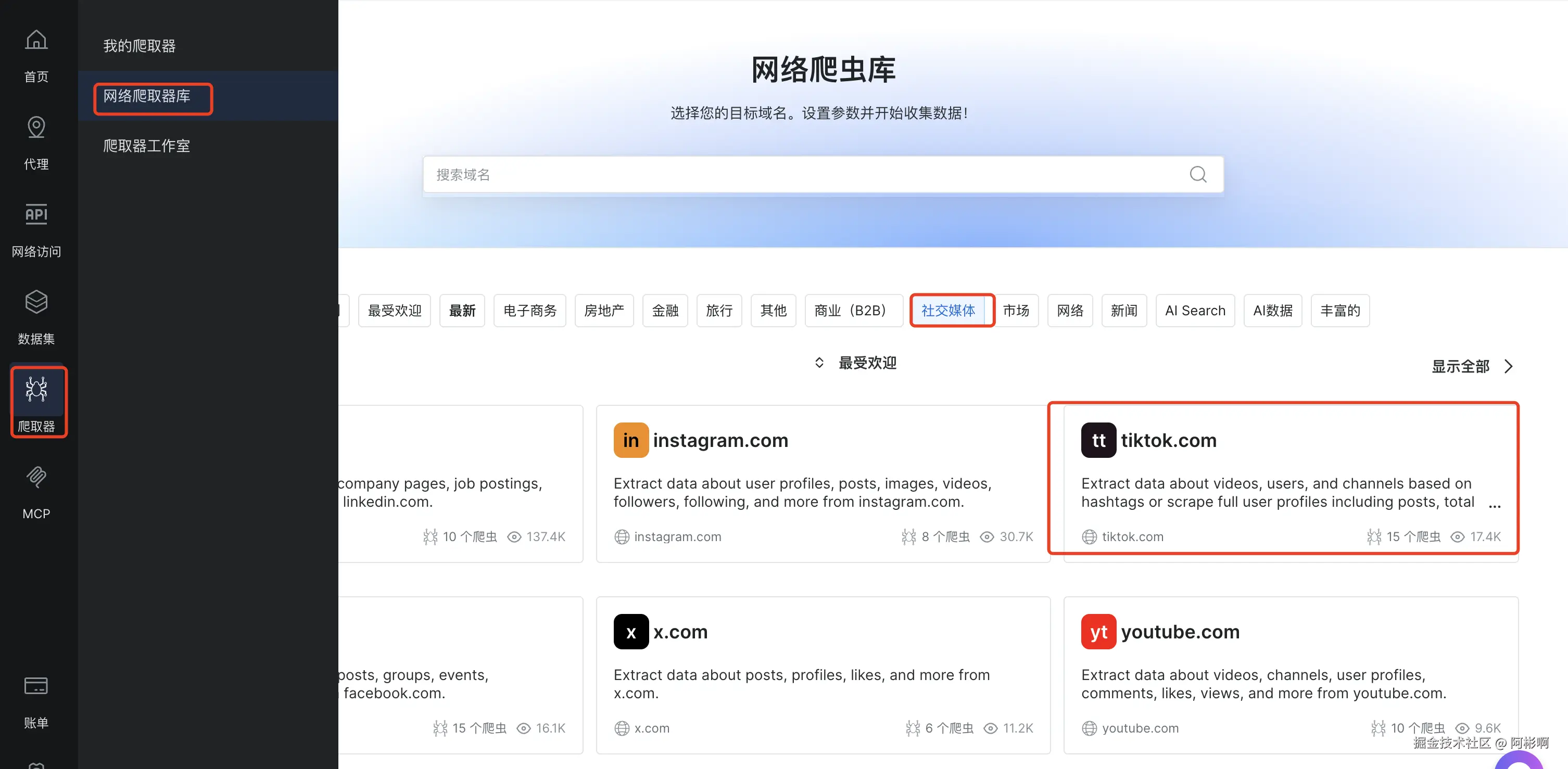 登录到Bright Data用户控制面板之后,选择左侧菜单“爬取器”中的“网络爬取器库”,然后选择分类中的“社交媒体”,选择下面的“tiktok.com”