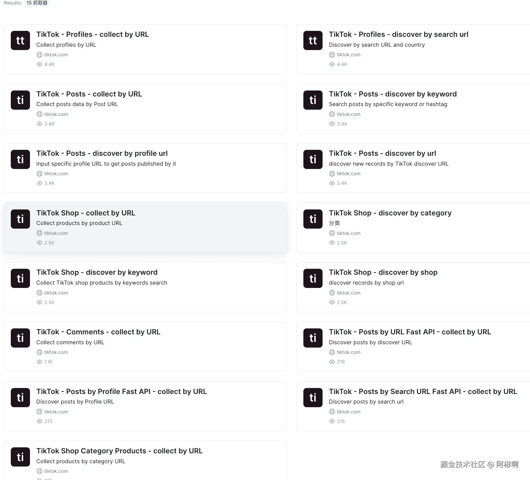 | 14 | TikTok - Posts by Search URL Fast API - collect by URL | 通过搜索 URL(利用快速 API)发现帖子 |