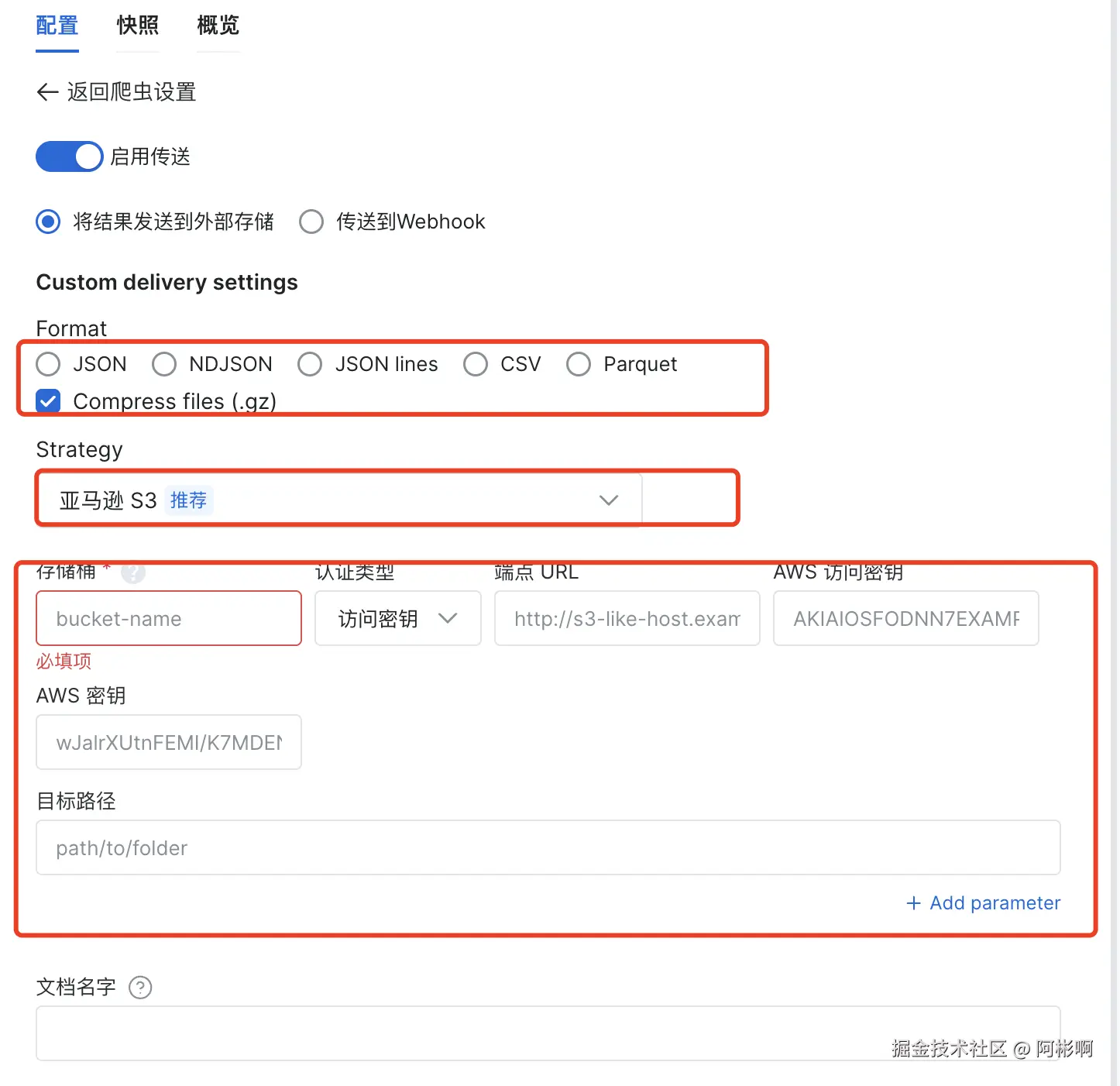 然后点击“启用传送”,就可以设置云储存的一些配置,比如:存储的格式,存储策略,存储桶名称等等,直接在云上查看数据更方便