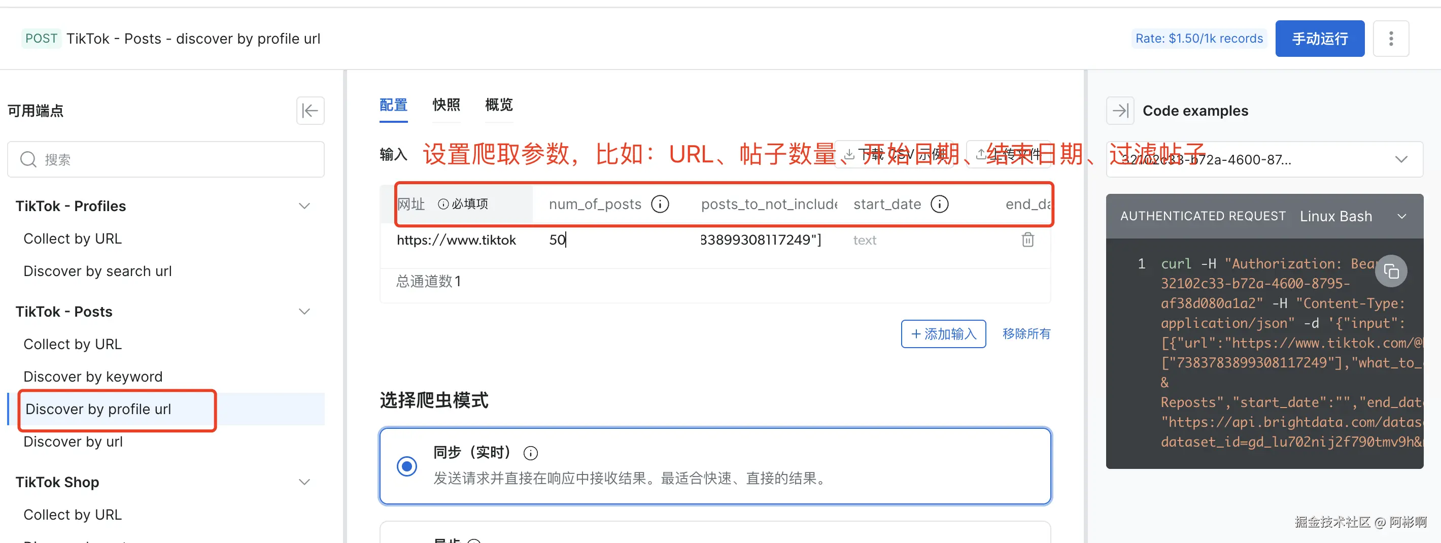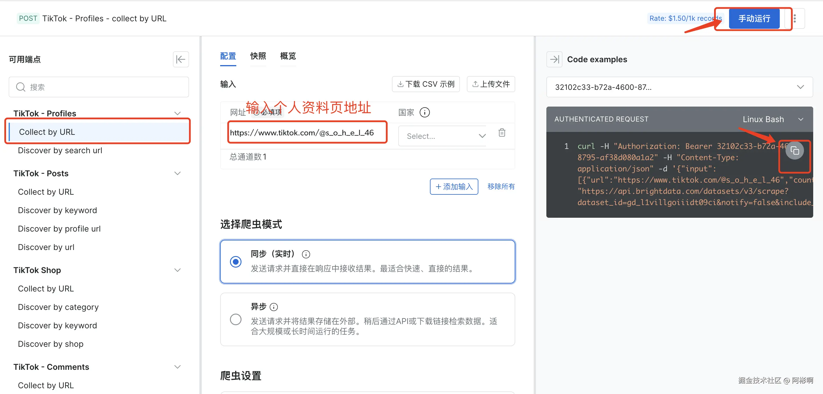 Bright Data TikTok 帖子抓取器兼顾 API 专业模式和无代码控制面板模式,无需复杂的技术开发,即可快速搭建 TikTok 市场研究的数据分析流程,核心分为四步,简单易操作,适配技术和非技术团队: