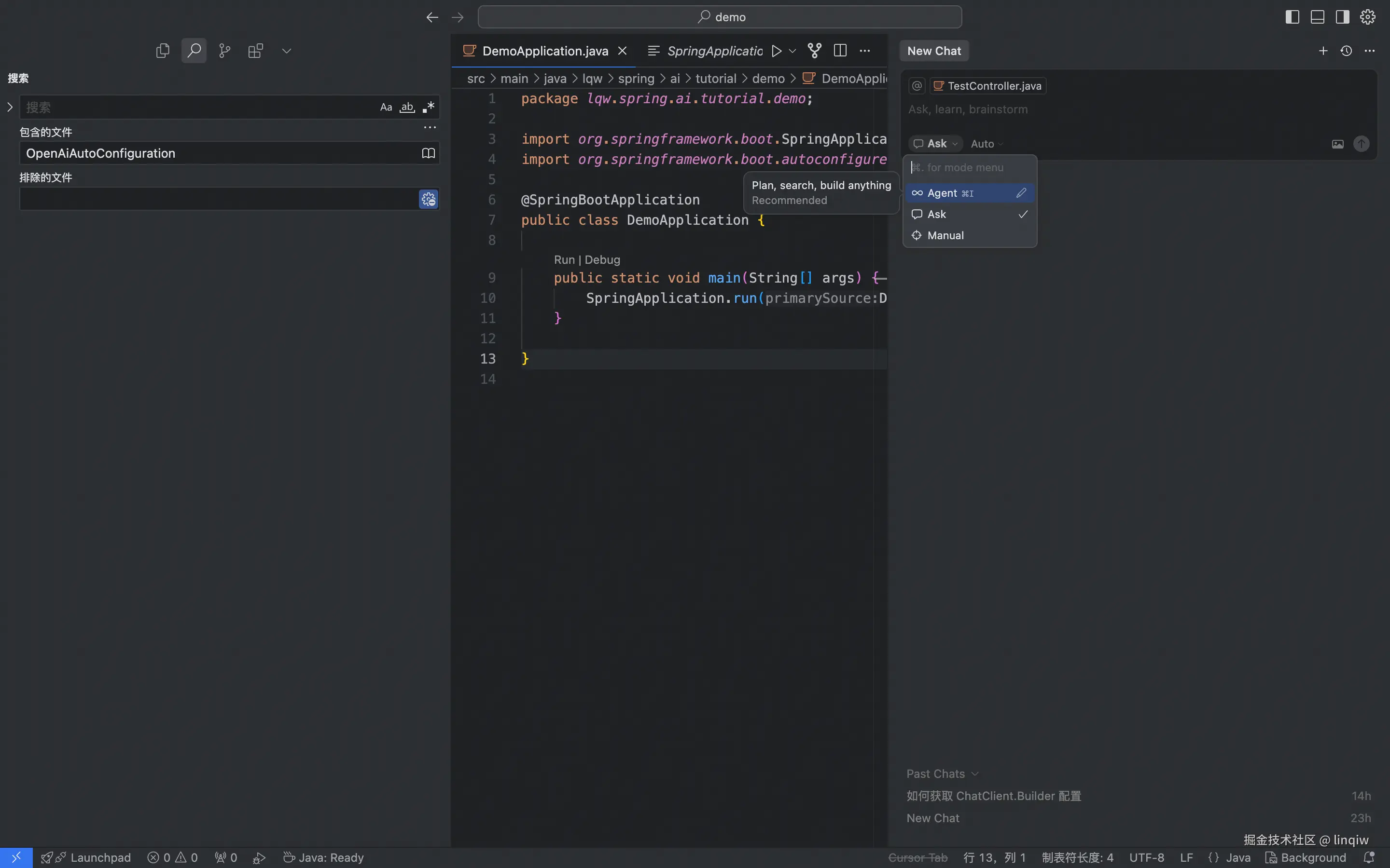 在resources/application.properties配置spring.ai.openai.api-key、spring.ai.openai.base-url、spring.ai.openai.chat.options.model