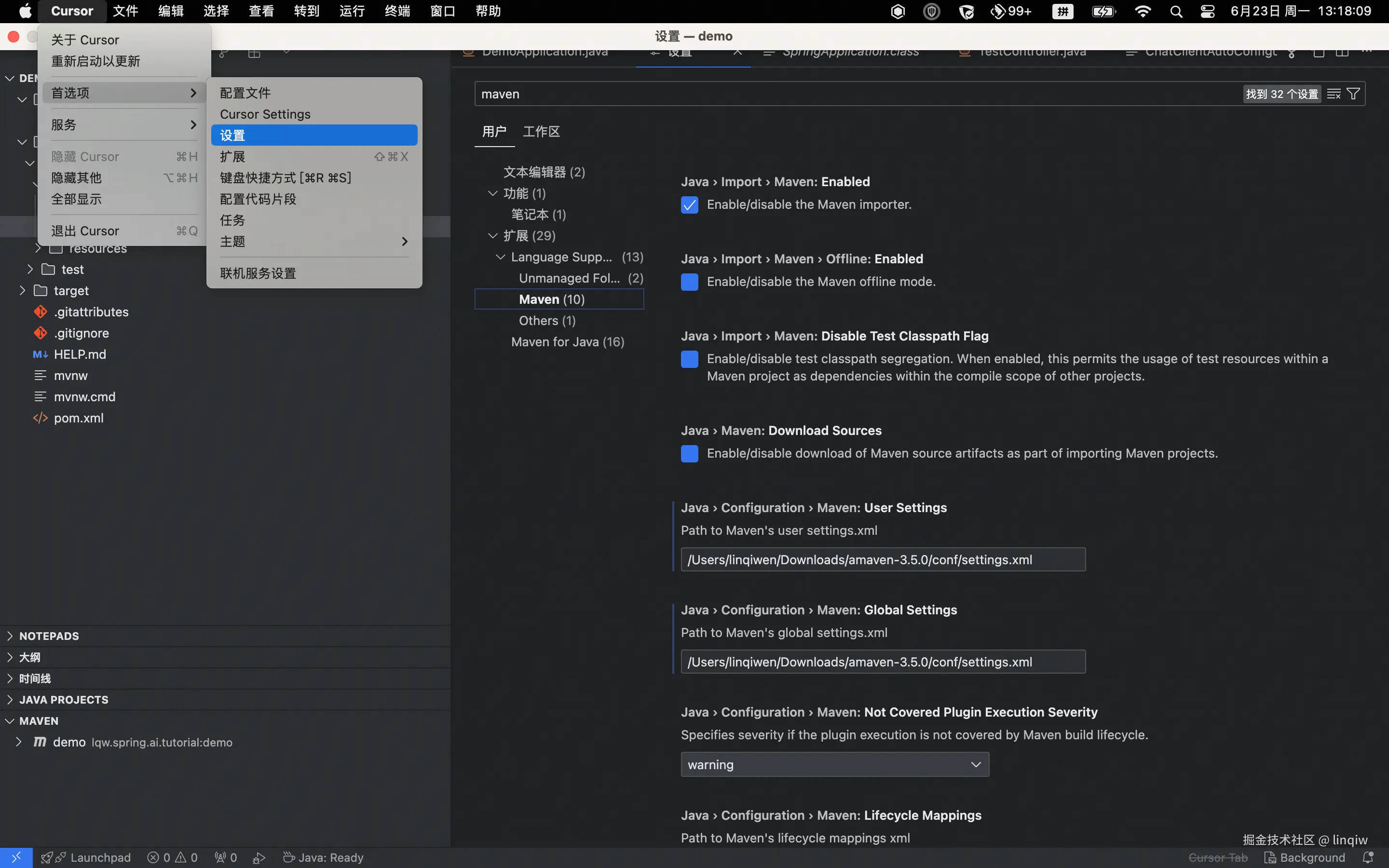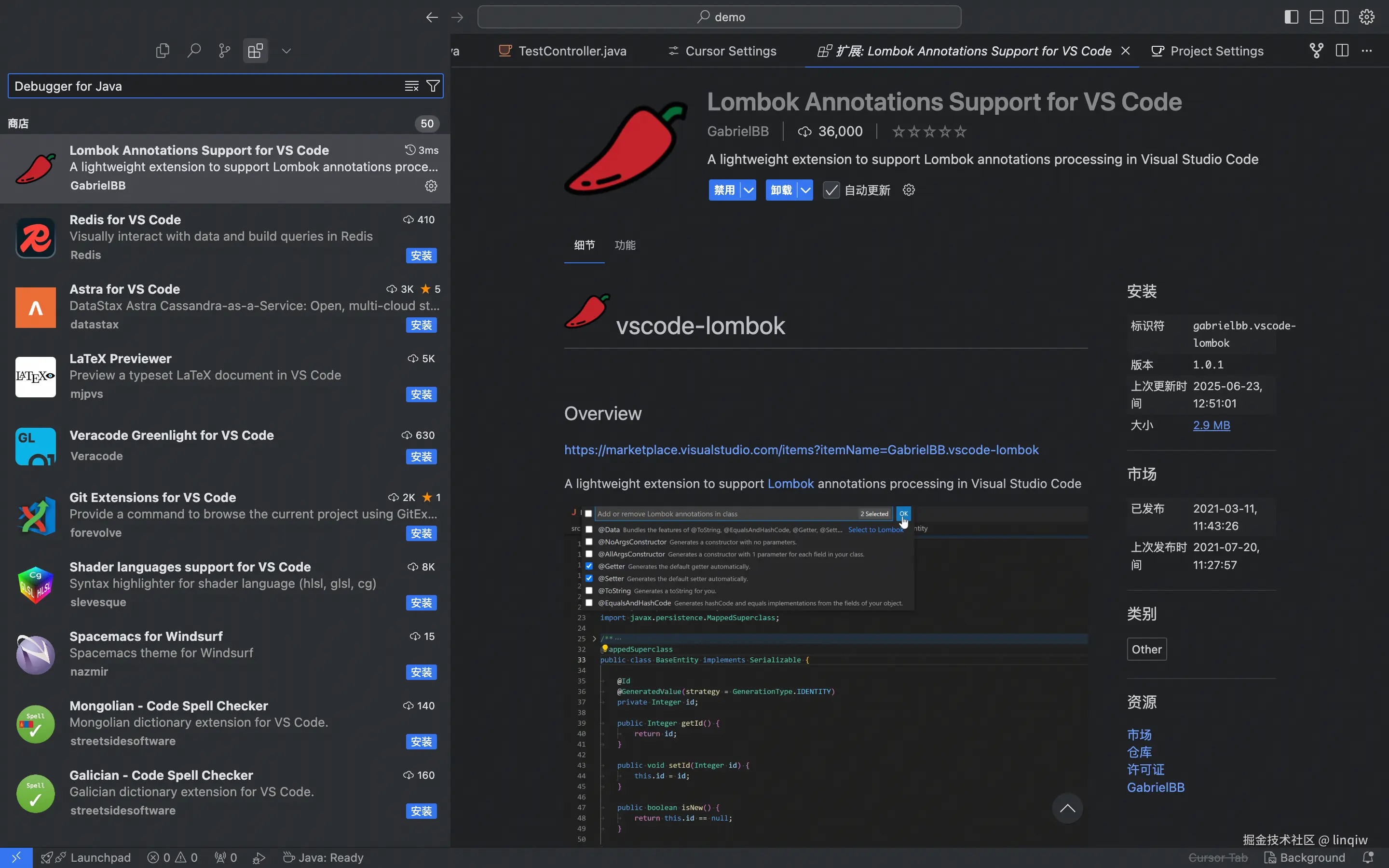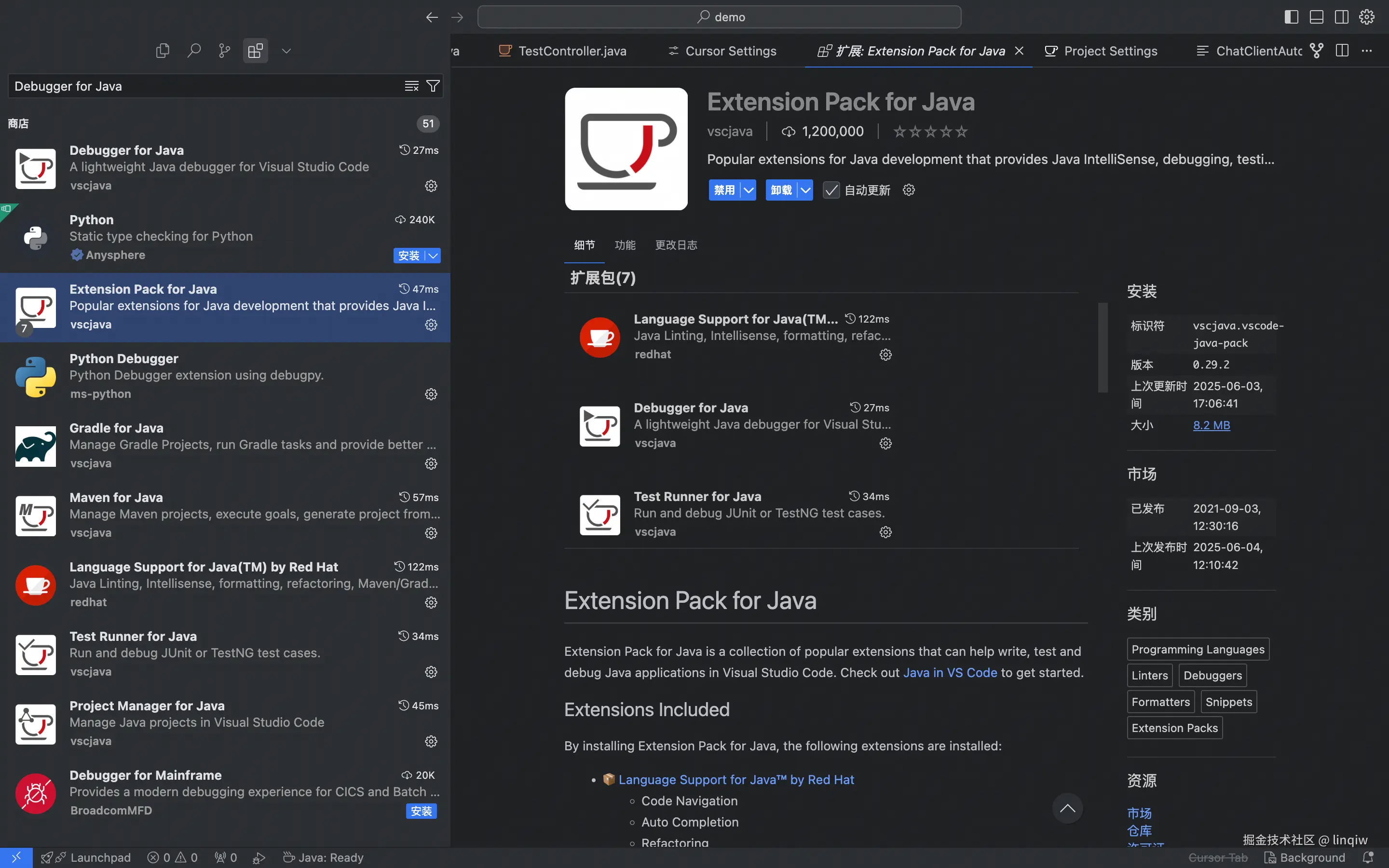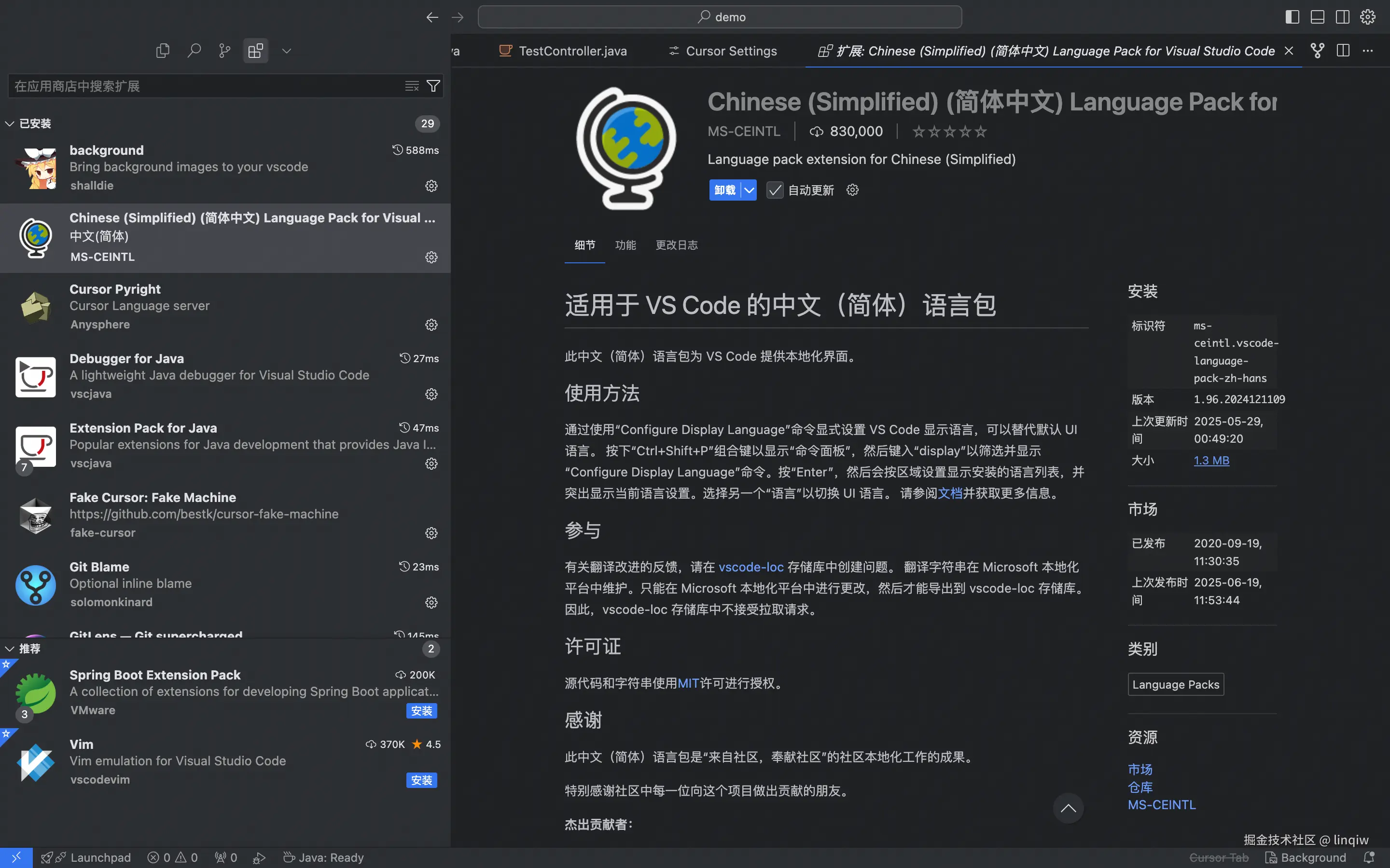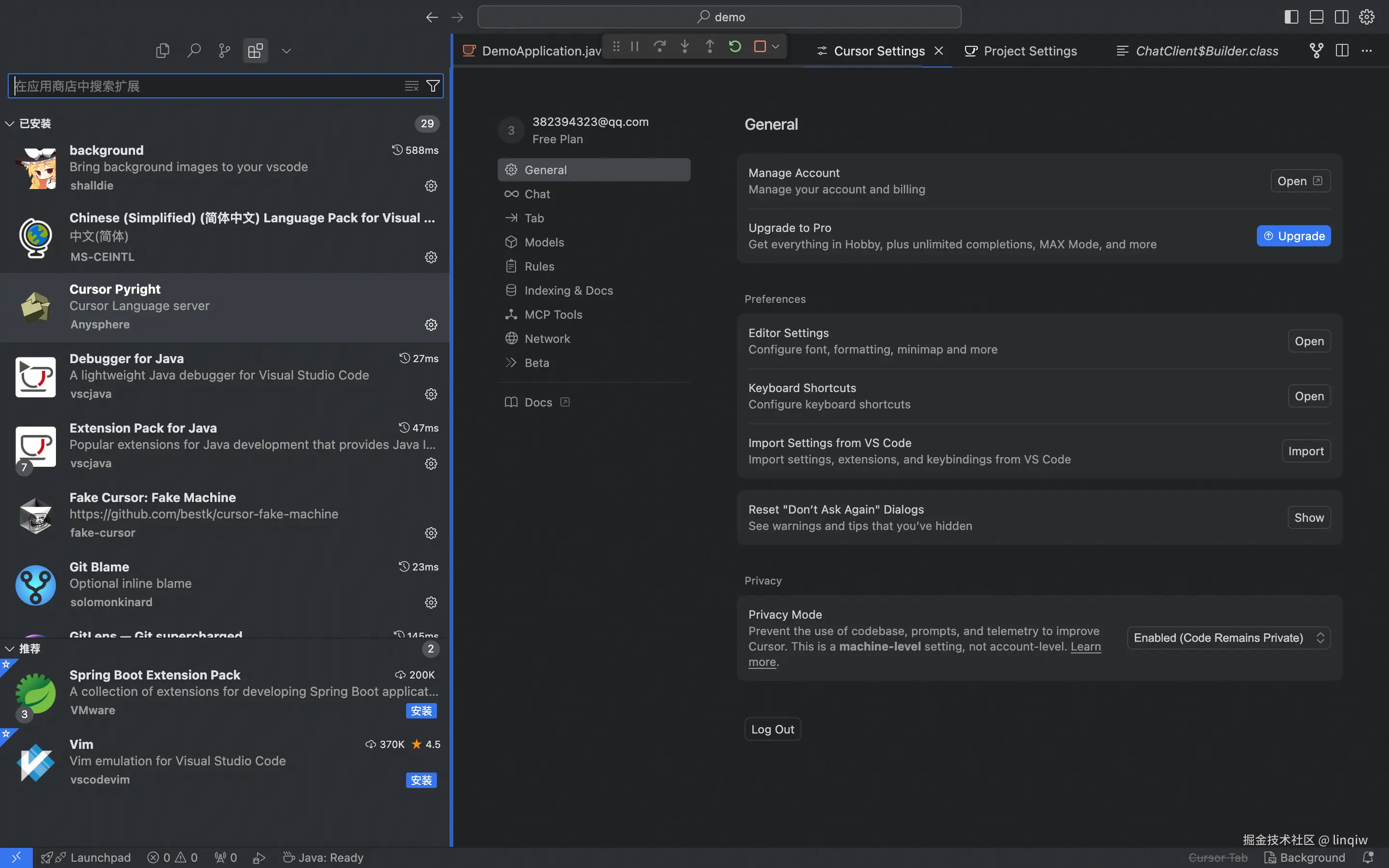 刚下载的cursor几乎没有任何功能,需要用安装插件的方式来把一个cursor组装为Java开发平台。切换到插件搜索下载即可