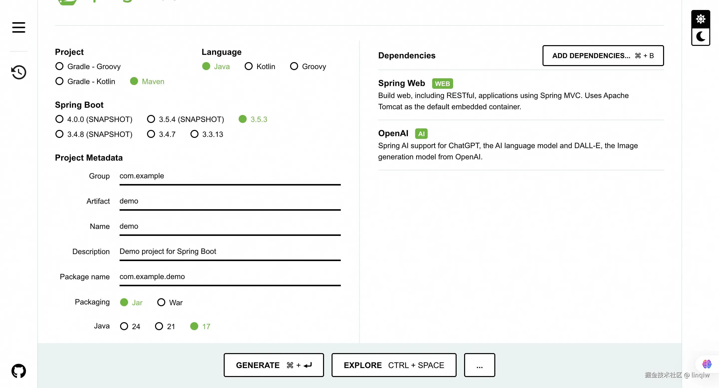 访问start.spring.io/按截图所示勾选依赖,生成spring-ai项目代码框架