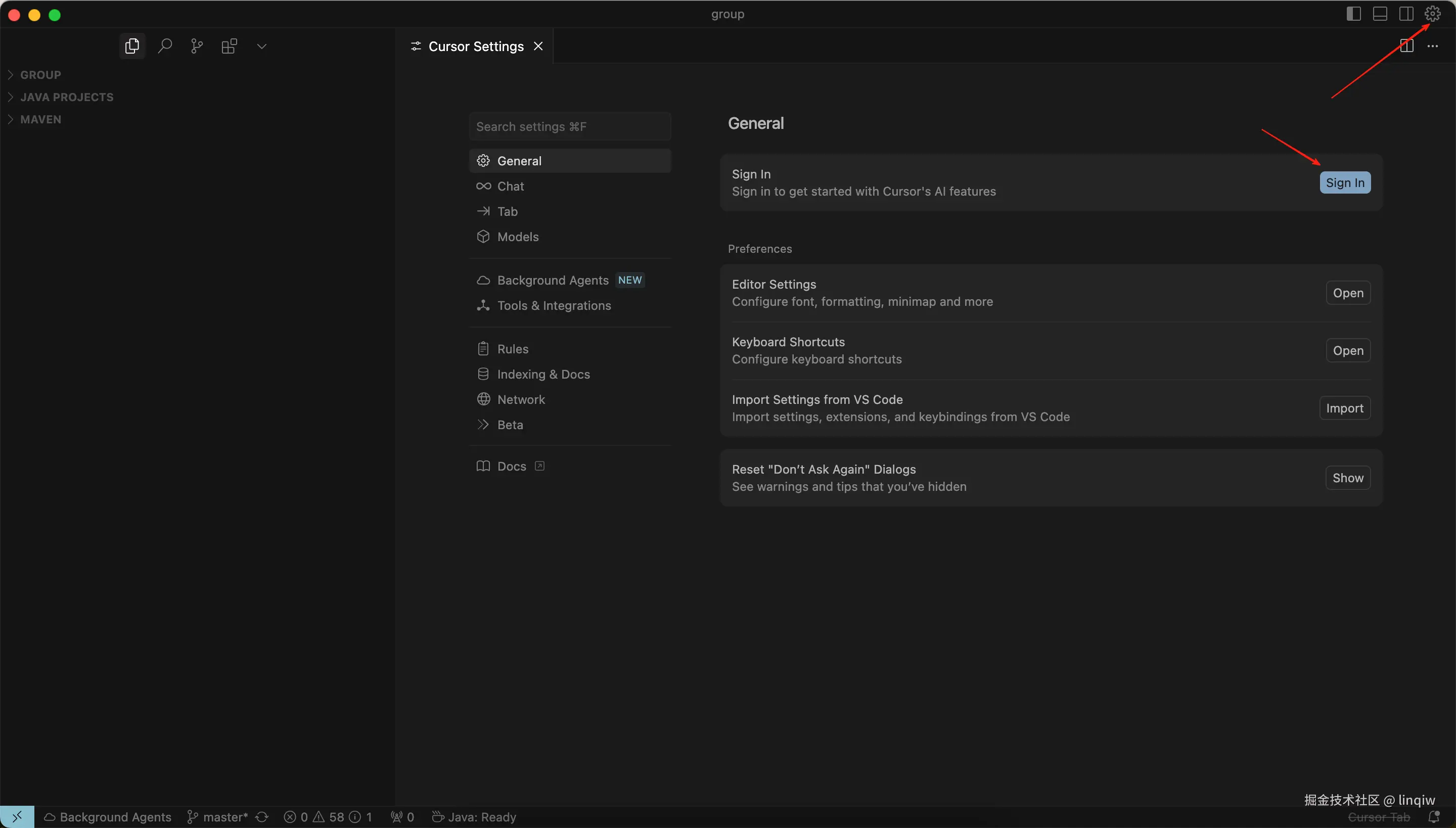 安装好cursor后,打开cursor点击右上角的设置,进行cursor账号登录,如果没有账号可以用邮箱先注册一个