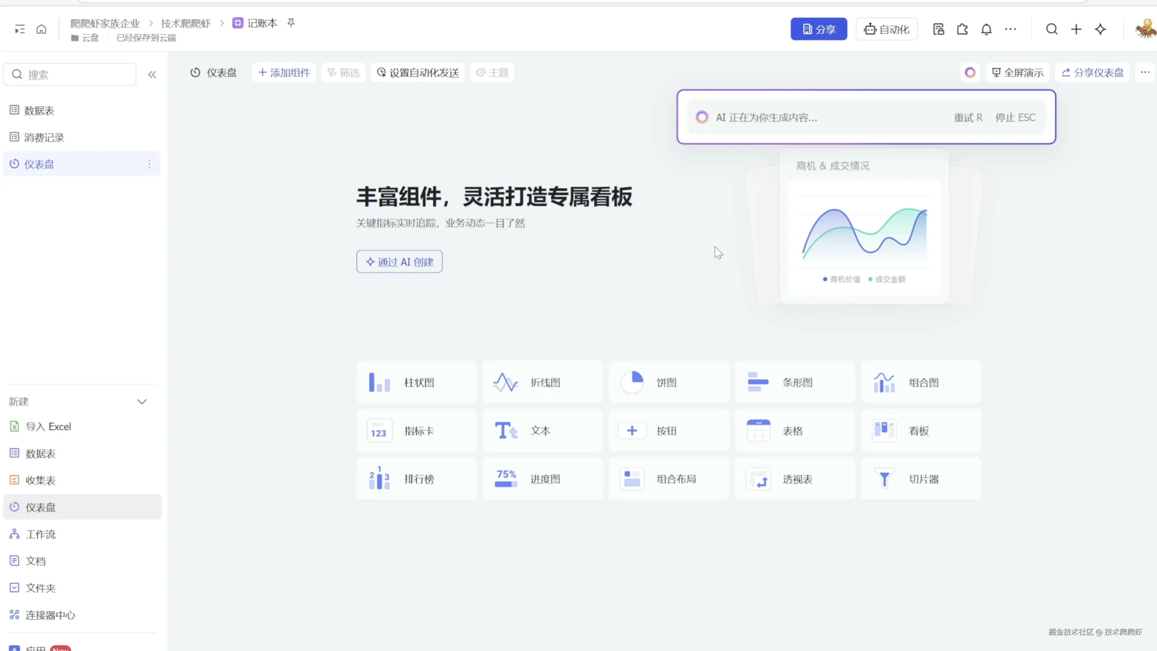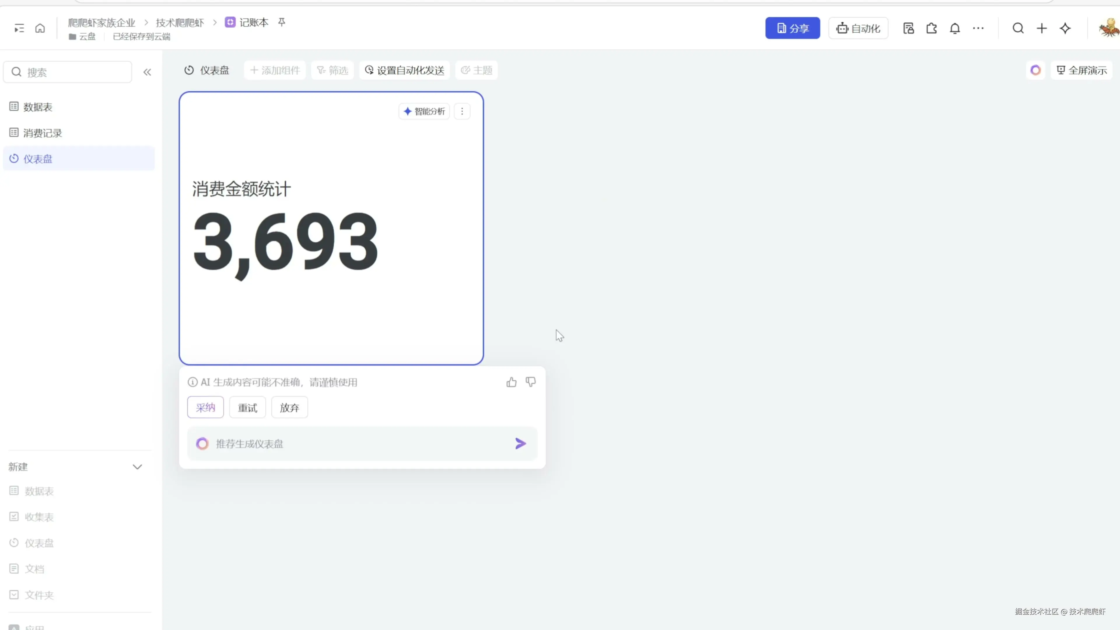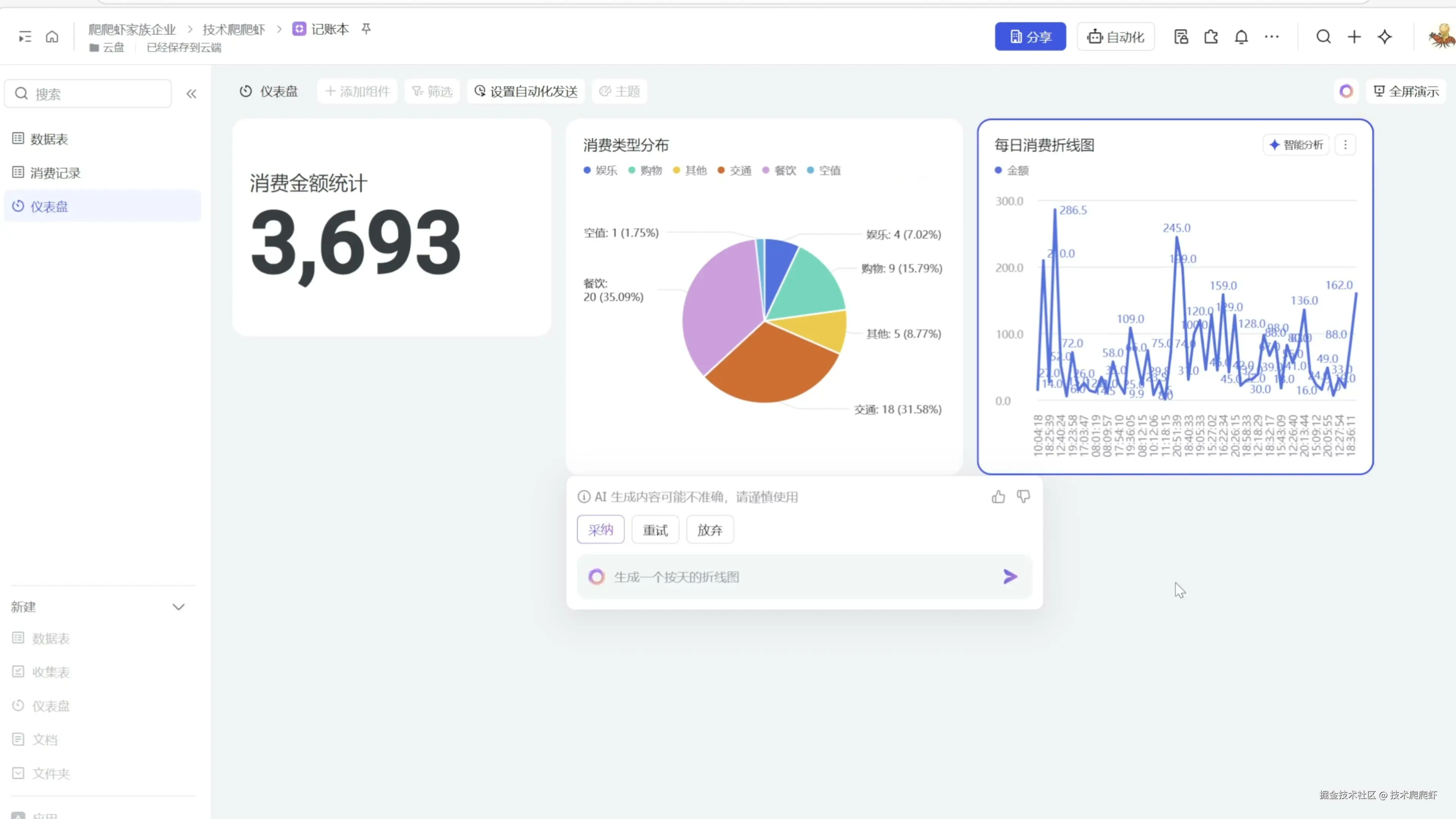 这些数据在多维表格里面,可不是冷冰冰的死数据。我们可以借助多维表格的仪表板,生成各种统计,对数据进行多维度的展示。我们找到左下角的仪表板,点击加号,创建一个新的,点击“通过 AI 创建”,可以让 AI 为我们先创建一个打个样。 这里,它为我们做了一个消费金额的统计。