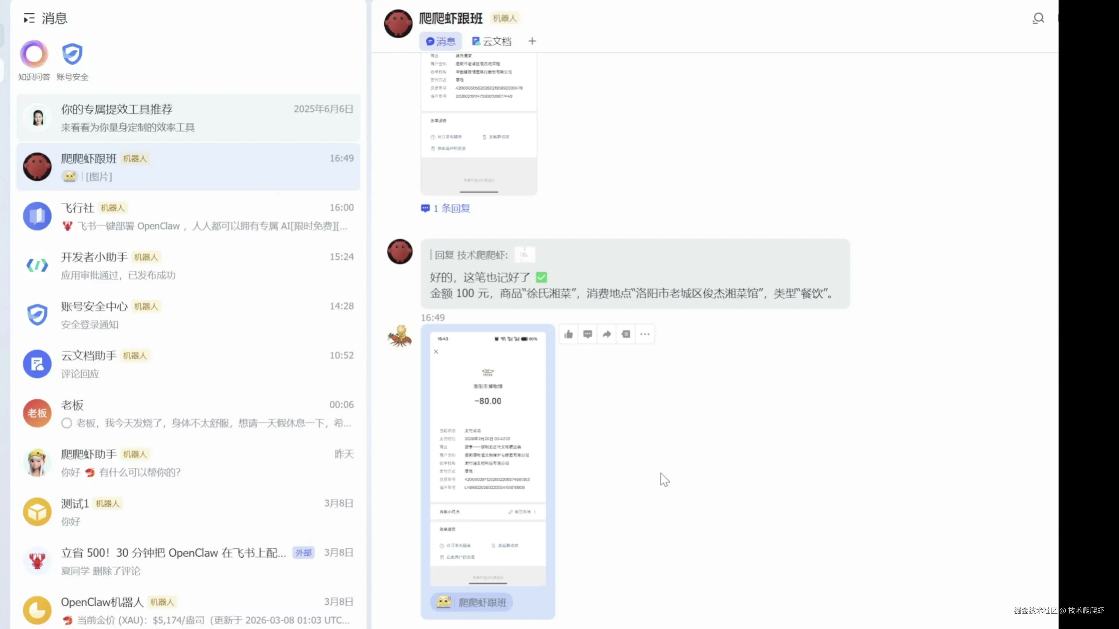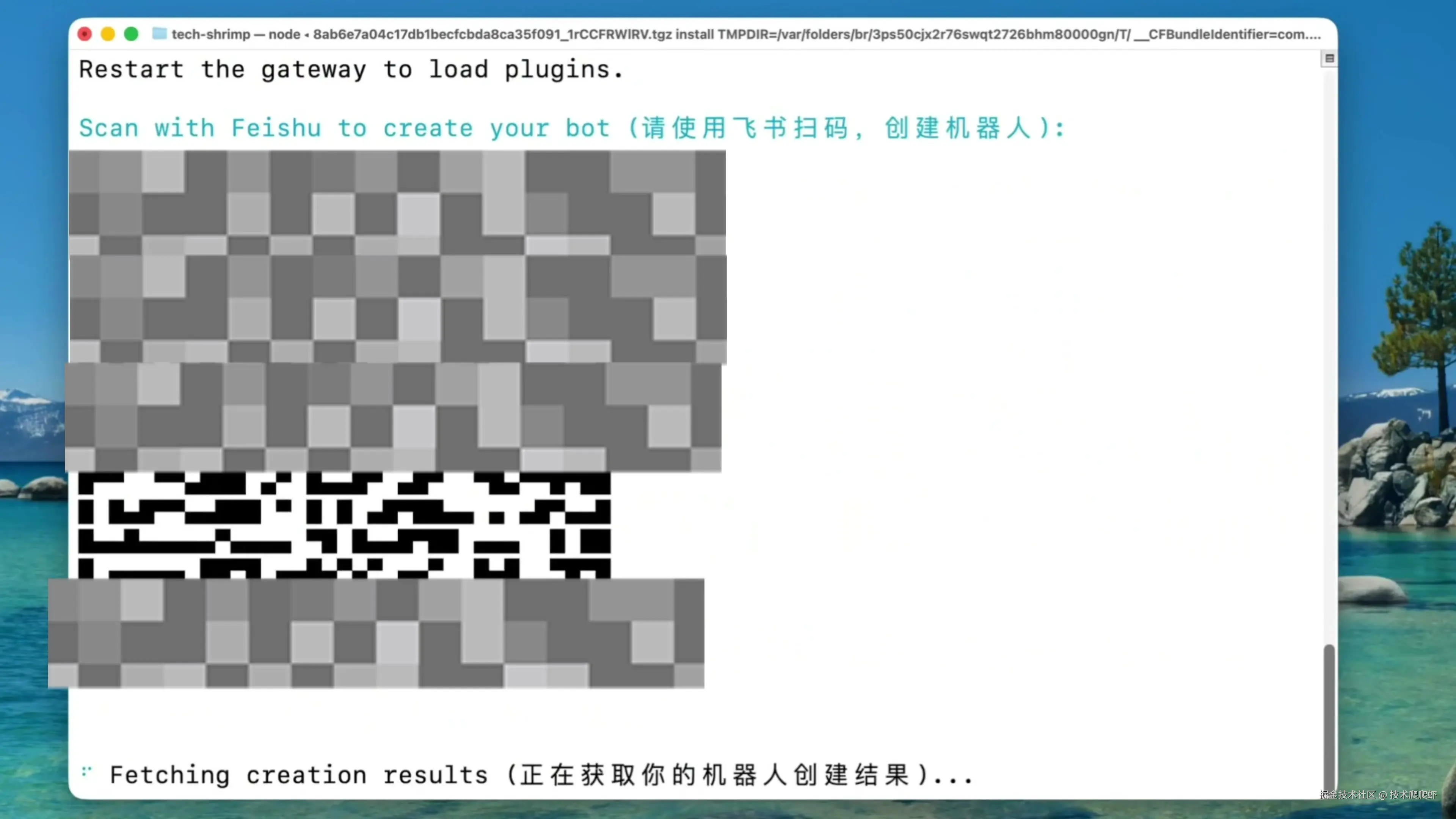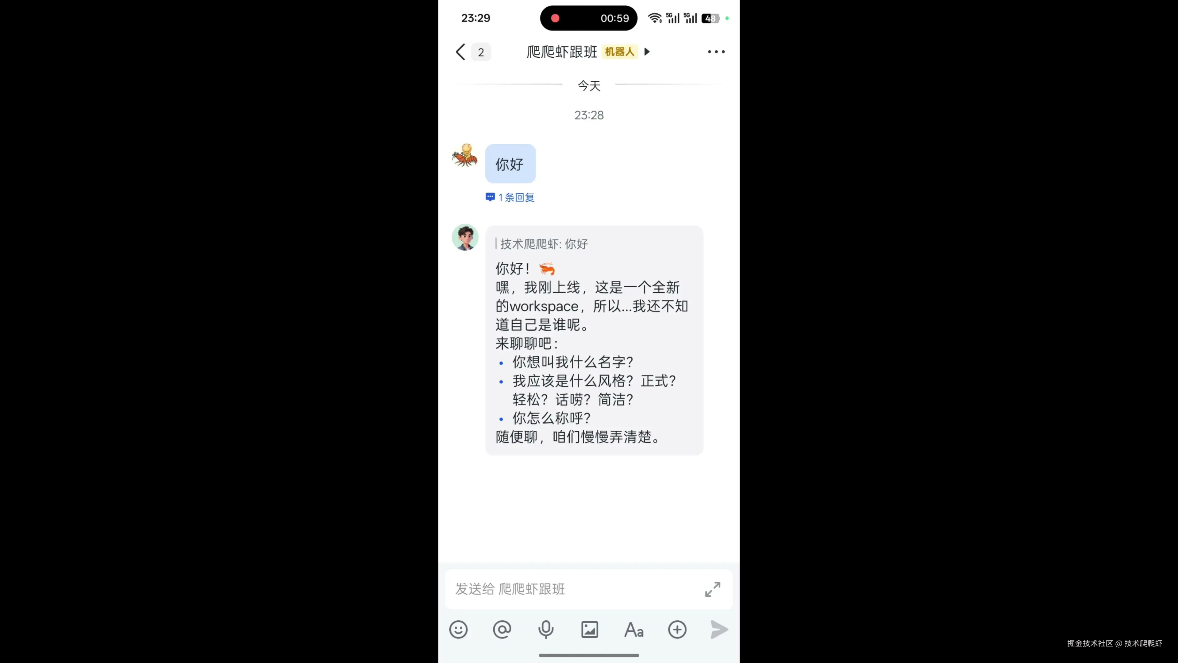 我们还是回到刚才的安装页面,过了一会屏幕上就出现了一个二维码。 我们直接用手机飞书扫描这个二维码,就能全自动创建机器人。 机器人创建好以后,发个消息,给出了回复,我们就配置完成了。