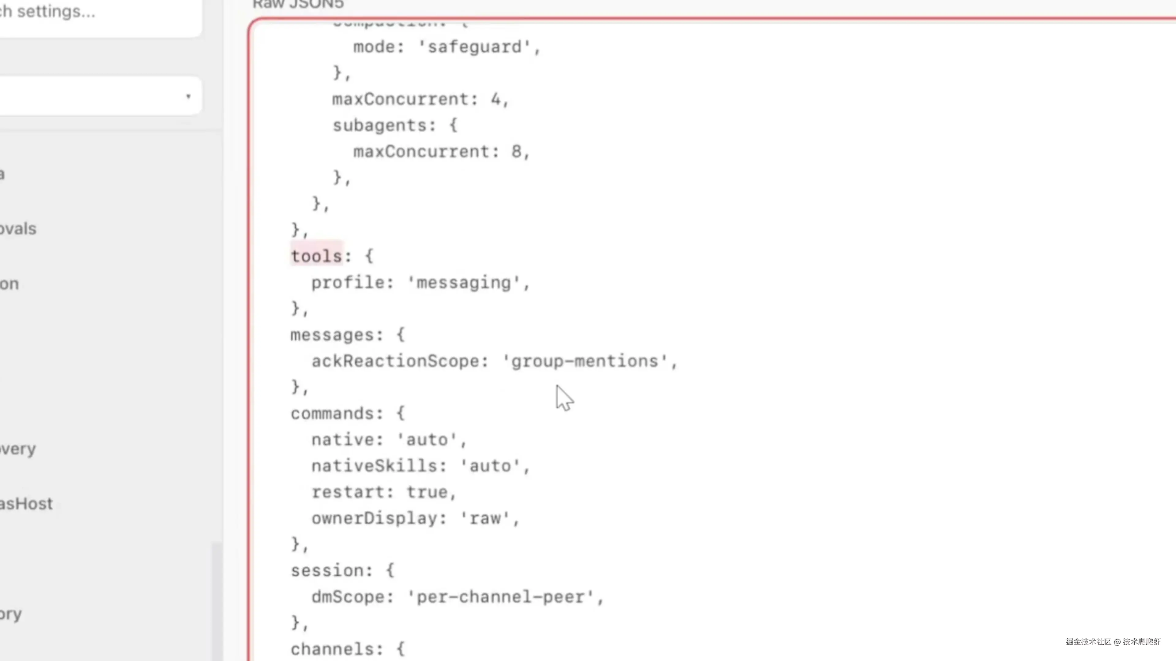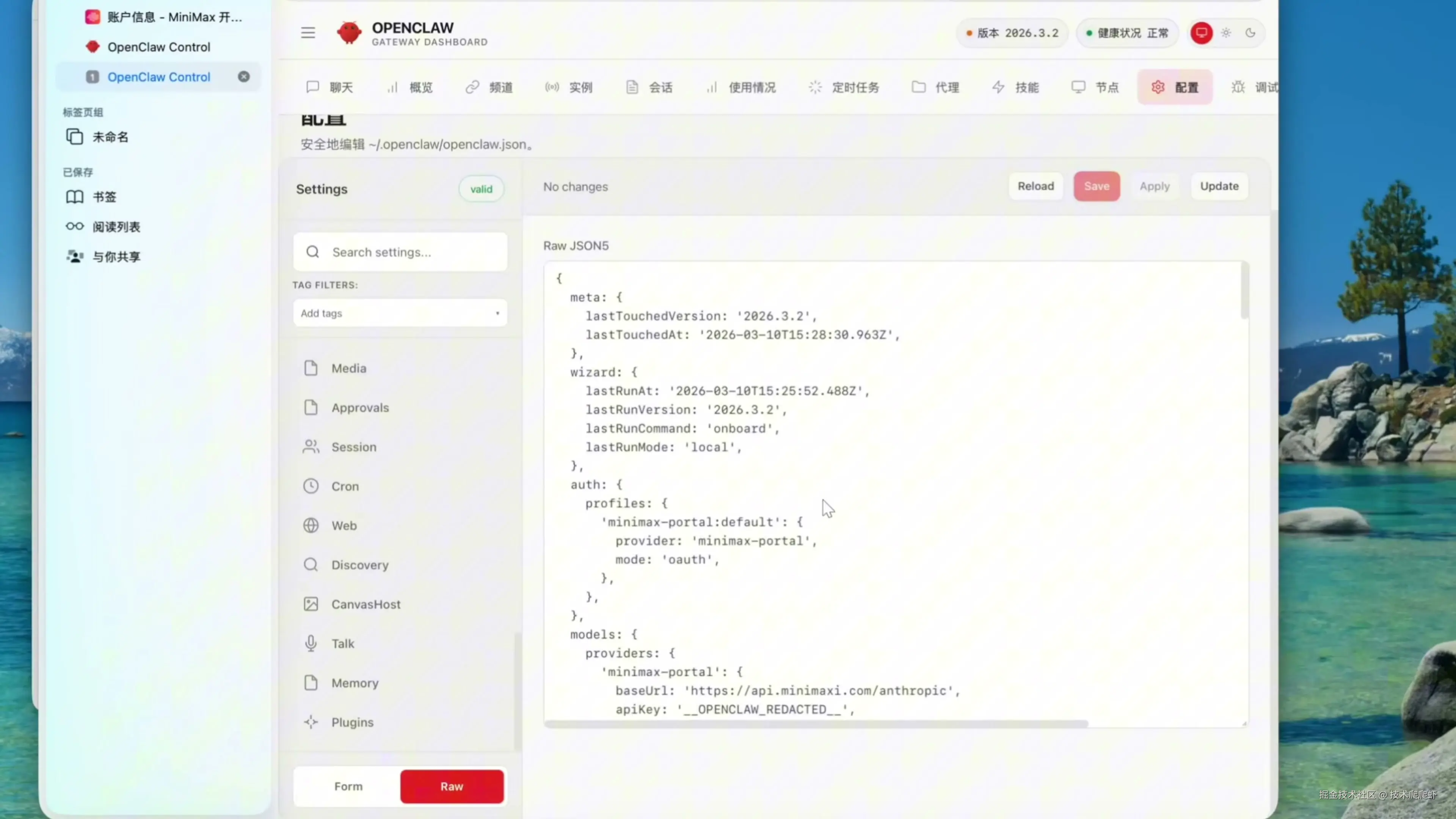 安装完 OpenClaw 以后,要做的第一件事就是来修改一个配置。我们来到 OpenClaw 的控制台,找到设置,开启 Raw 也就是源文件模式。 我们要修改的是