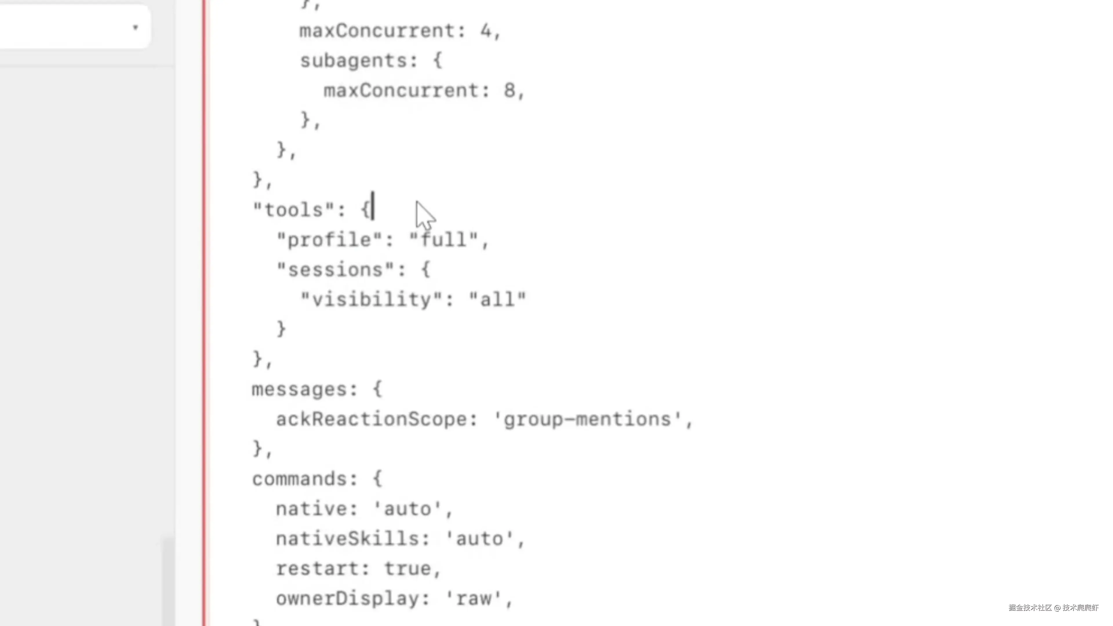 <font style="color:rgb(26, 26, 26);background-color:rgb(253, 253, 253);">tools</font> 这一段。在默认配置,也就是 <font style="color:rgb(26, 26, 26);background-color:rgb(253, 253, 253);">messaging</font> 模式下面,OpenClaw 只能进行聊天,做不了任何其他的事情。 我们把飞书插件 4.4 这一节复制下来,拷贝到配置里面,把它修改成