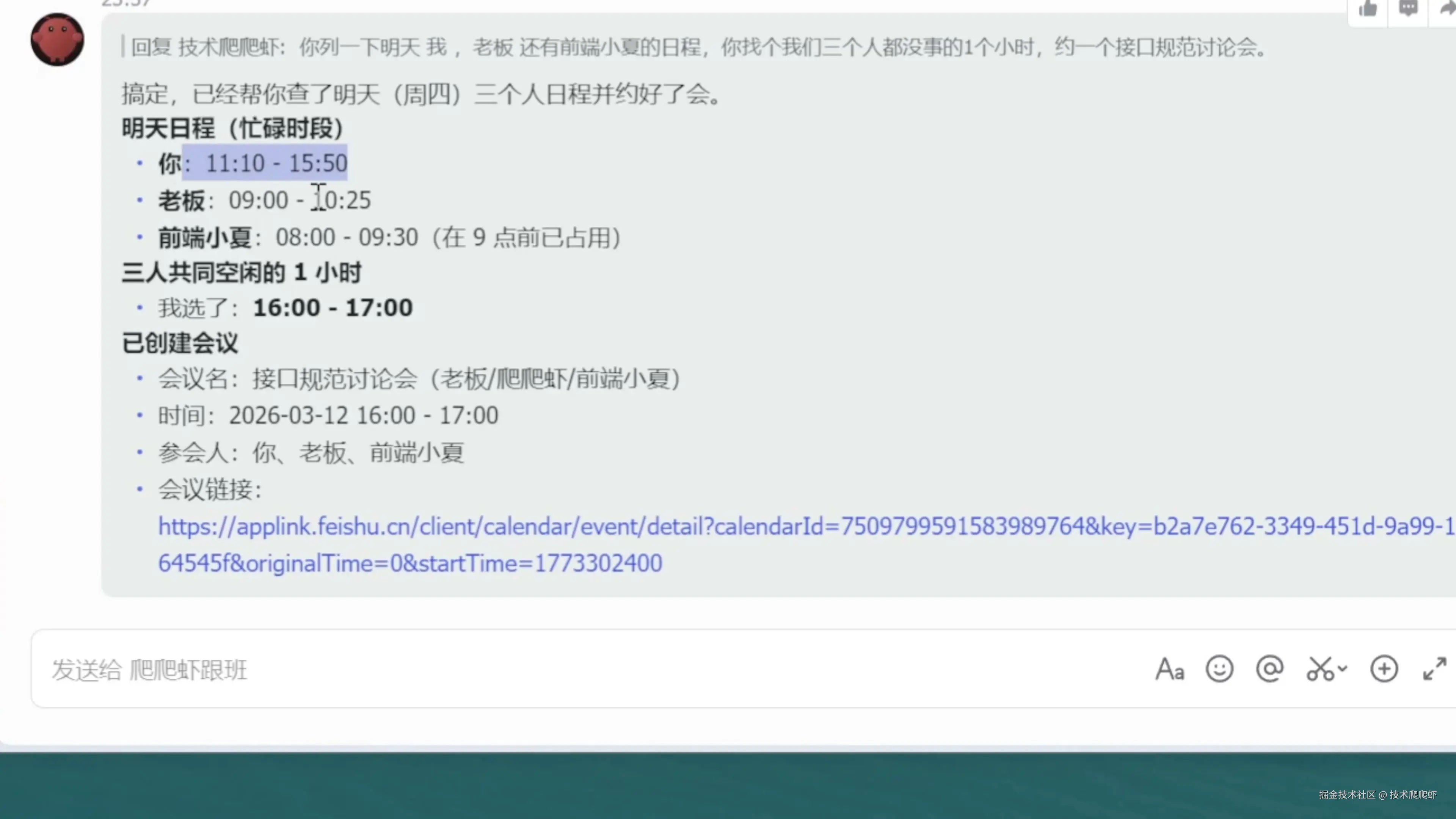如果你们公司的办公软件恰好是飞书,那你有福了。在飞书官方插件的加持下,AI 可以调用飞书里面几乎一切可用资源,来为你的办公场景服务。比如“爬爬虾”是一个程序员,一天里忙于应付各种琐事,到了临下班晕头转向的,甚至都不记得今天干了些啥。这时候如果要我写日报,那就得去翻各种聊天记录,才能勉强捋清楚。这种工作就完全可以交给 OpenClaw 来代劳。“你搜一下我今天所有的聊天记录,整理一个我今天的日报,然后发给我审阅。” OpenClaw 真的能搜索到我所有的聊天记录,比如找到了我今天完成的工单、起草的合同、支持的测试、解决了前端问题,还跟产品经理对需求等等。最后输出了一个日报,发送给我审阅。 我确认后,还能直接让 OpenClaw 以我的身份发给老板。我们再来看一个例子:“查一下老板、前端小夏,还有我明天的日程,找个我们三个都空闲的时间,约个一小时的会。” OpenClaw 查阅了我们三个人的日程安排,找到了一个我们三个人都空闲的时间,直接创建出了会议日程。 在飞书官方插件的加持下,这就是一个最懂我的贴心秘书,简直完美。