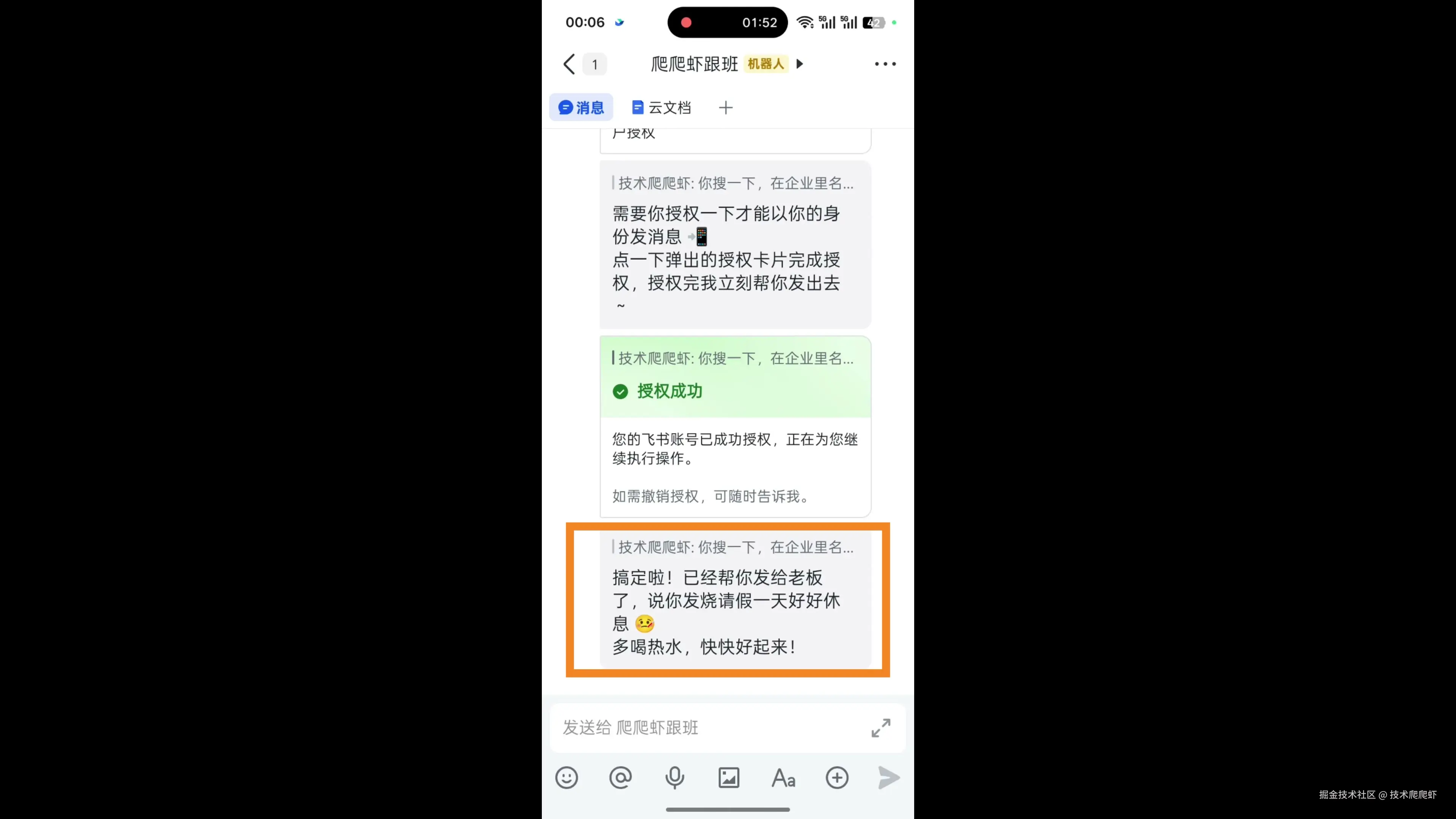 授权以后,机器人就可以直接读写飞书的数据。 飞书官方插件最大的变化,就是可以直接以用户的身份来执行操作,彻底为“龙虾”解放了在飞书的手脚。我们给 OpenClaw 说:“你给老板发个消息,说我今天请假。” OpenClaw 询问了一些细节,接下来它要求申请一个代替用户发消息的权限,我们按照卡片提示授权一下。 接下来它真的成功完成了操作,直接用我的账号发出了请假消息,这可太好玩了! 这里我要补充一下,这个企业并不是我真实工作的企业,老板也不是我真的老板,而是我为了演示功能创建的小号。OpenClaw 整体还处于初级形态,生态内的功能都存在不稳定和安全风险,请大家在尝试前充分评估风险,谨慎用在真实的公司环境里面。