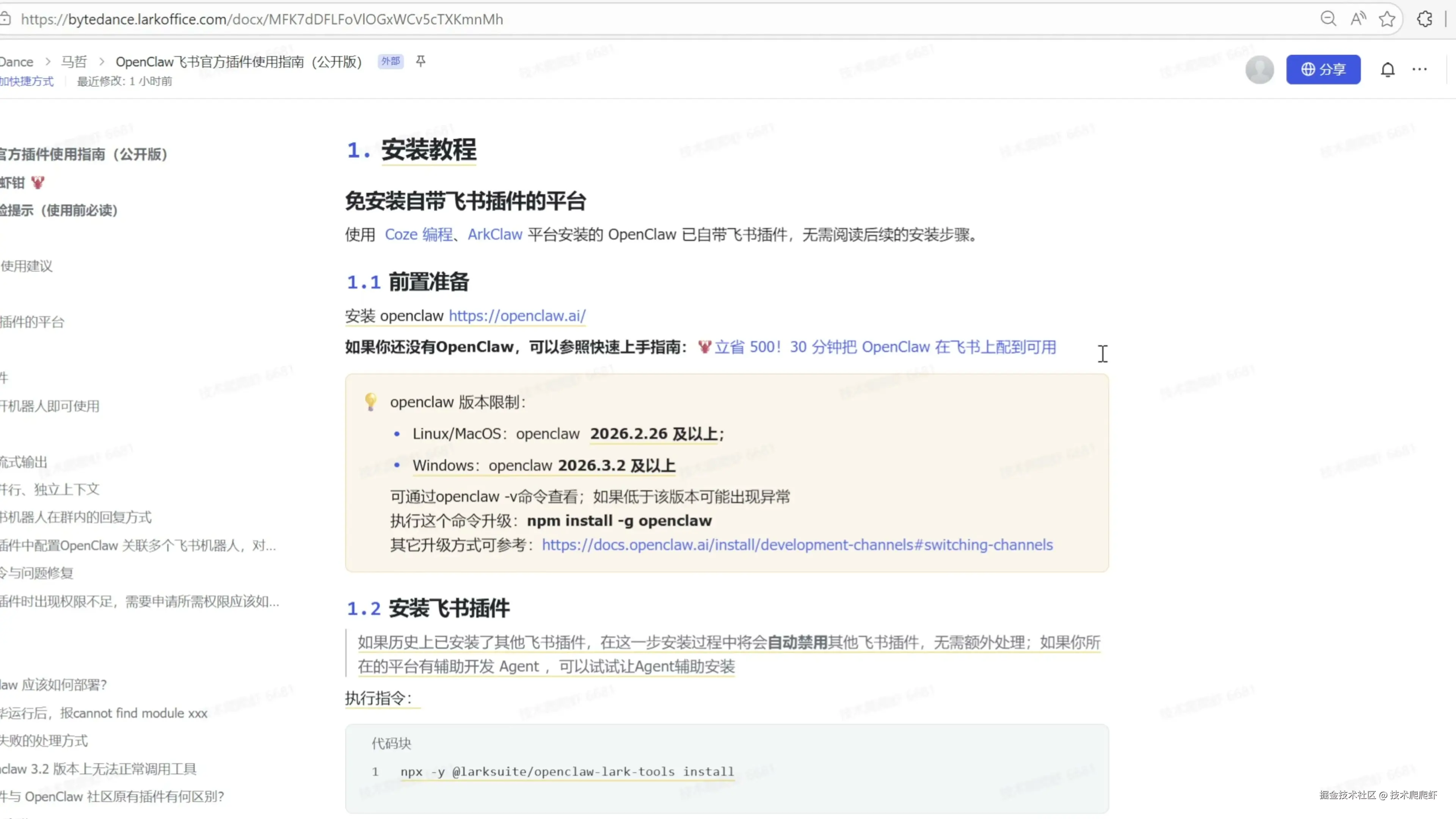 接下来可以安装飞书官方插件,我们复制文档里这一段命令,粘贴到命令行执行。