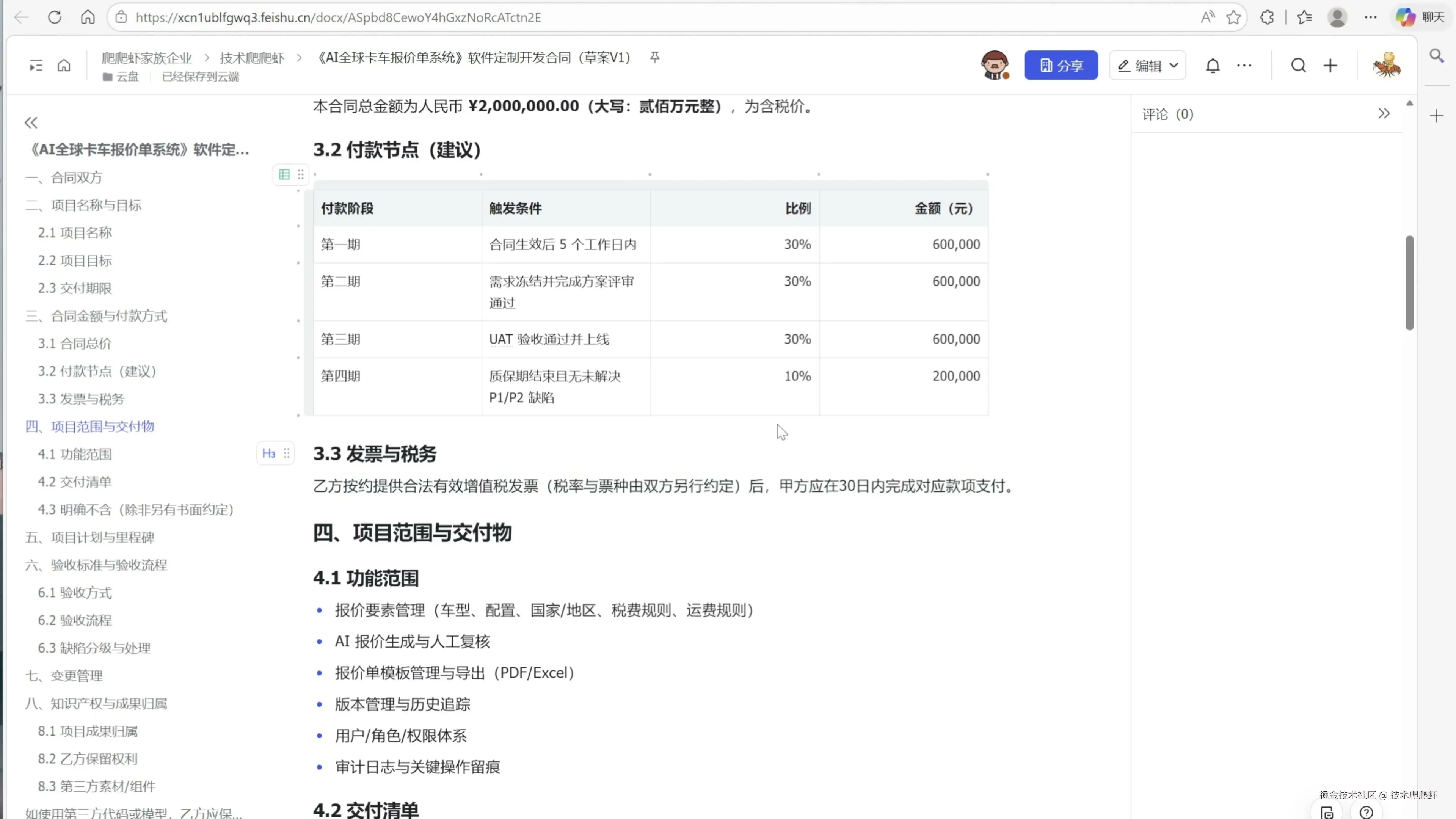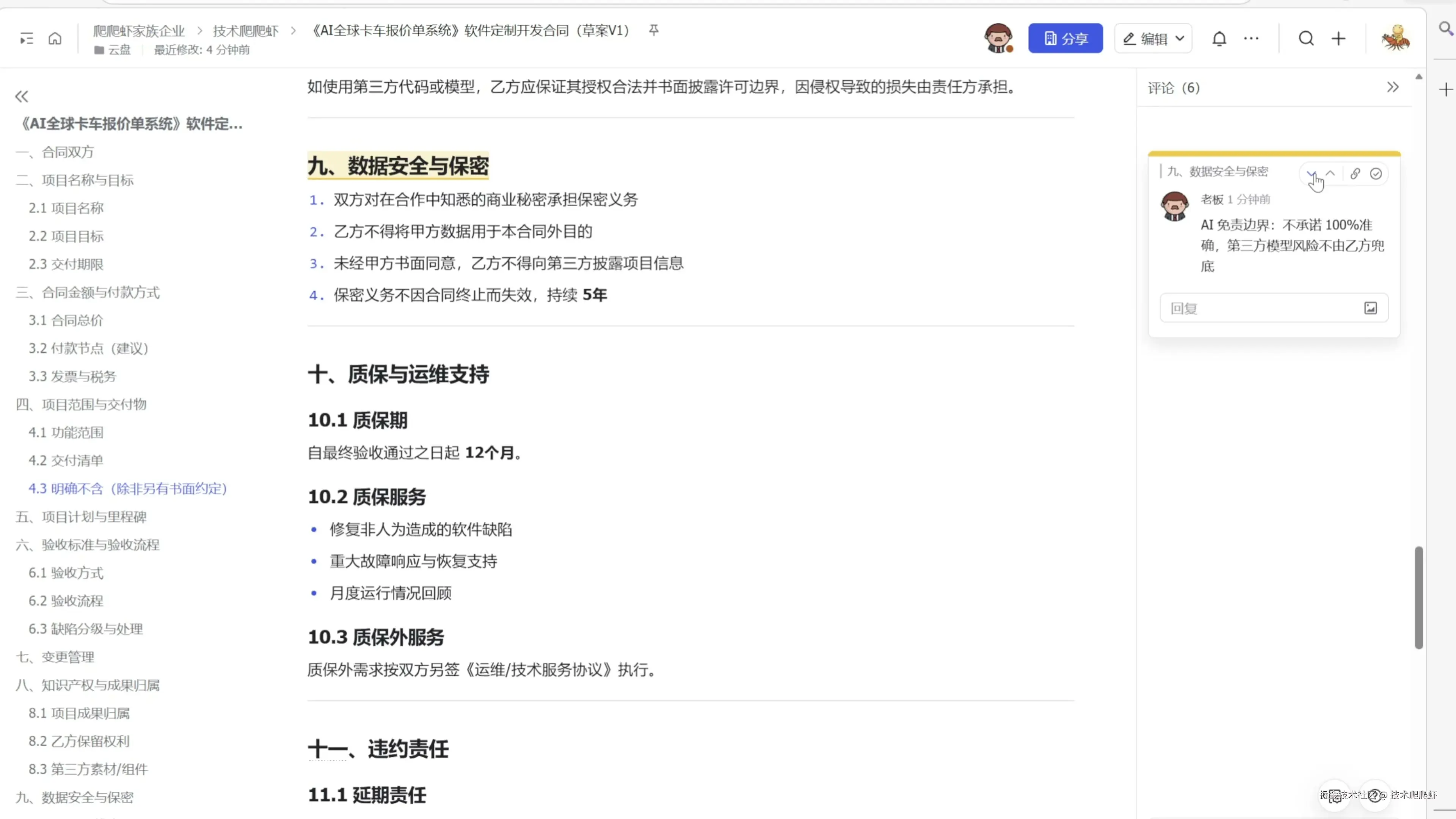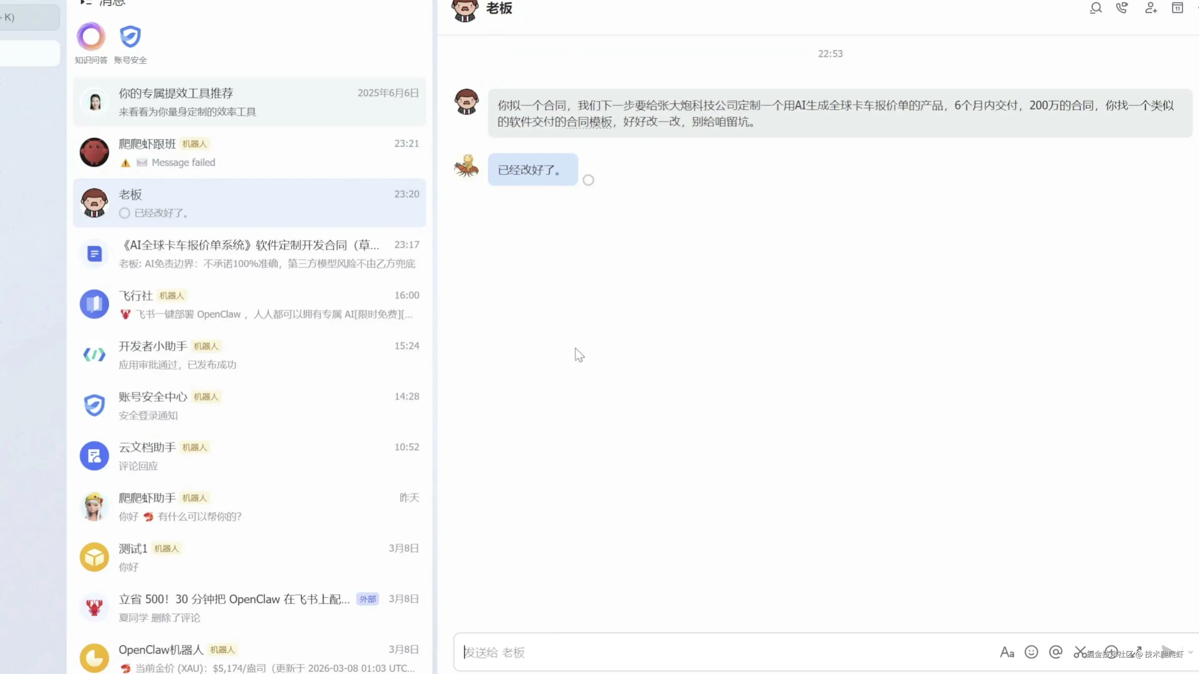 除了多维表格,飞书官方插件也可以帮助我们来操作文档。比如老板突然丢过来这么一个需求,让我拟一个软件交付类的合同,我们公司作为乙方。如果人工先去搜索合同模板,然后再来一步步的写,估计半天时间就没有了。我们完全可以把这个需求交给 OpenClaw。这里我跟我的小跟班说:“刚才老板给我发消息了,你去网上搜一搜怎么写,直接给我创建一个飞书文档。” 我们看到 OpenClaw 在后台调用各种搜索功能,来查找这类合同的标准写法,最后为我们交付了一个飞书文档。 更棒的是,这个文档的创建人跟拥有者正好就是我自己,从老板的角度看不出一点问题。当然,任何工作都不可能让老板一次性的满意,他在合同上又留了很多的批注。 这些批注当然也不用我自己手改,我跟 OpenClaw 说:“合同上老板留了很多的批注,你改一改。改了什么,做个摘要发给我,然后给老板发个消息说已经改好了。” 很快 OpenClaw 根据老板的批注点,逐一进行了修改,而且修改人就是我自己,天衣无缝。