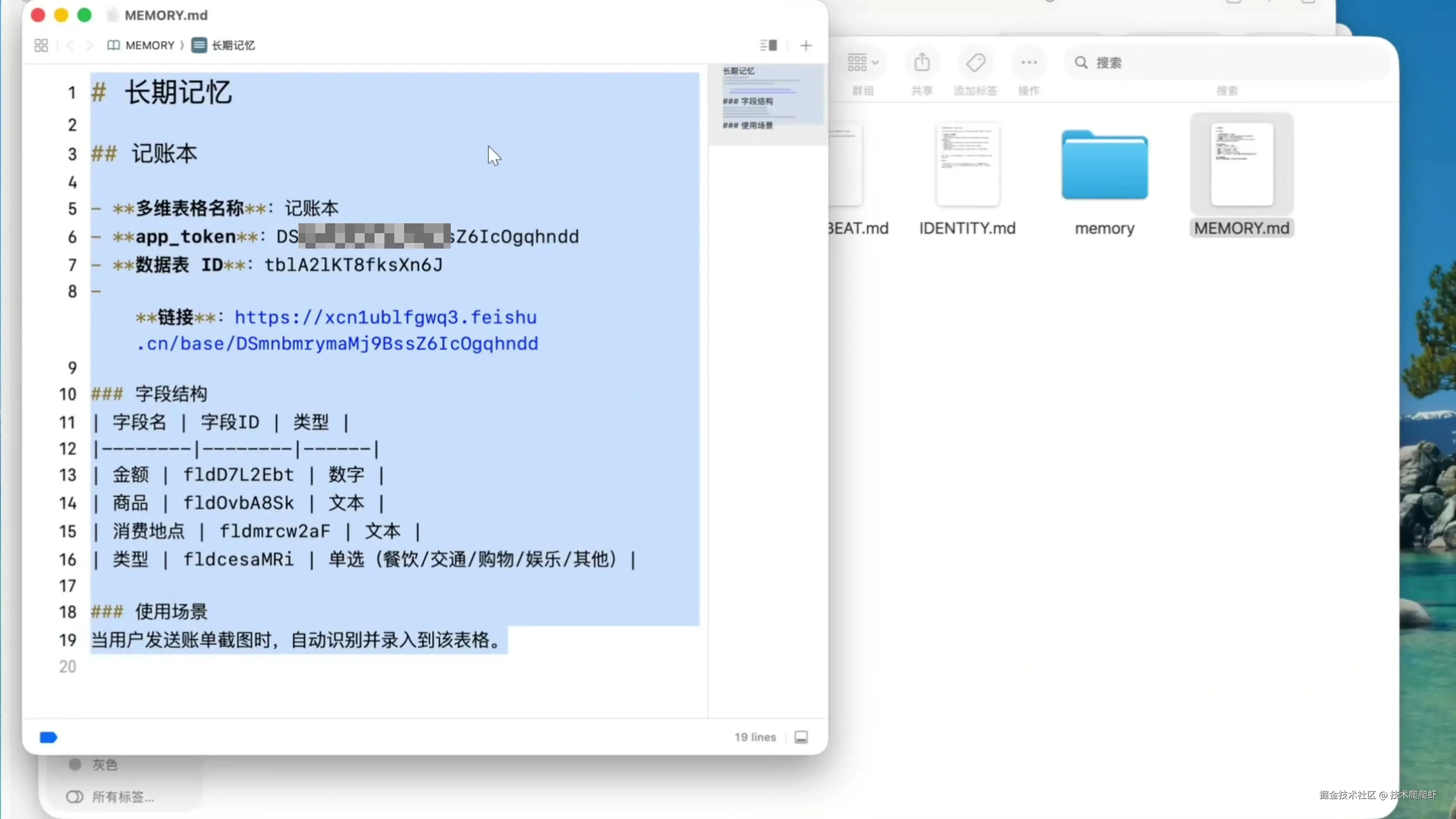 多维表格,我认为这就是飞书里面最强大实用的功能。多维表格迭代至今,远远超出了传统数据表格的功能,而是进化成了普通人也可以轻松上手的全能数据库。现在有了飞书官方插件,我们直接可以使用自然语言,零门槛创建一个私人数据管理系统。我们来看一个简单的例子,我可以直接跟 AI 说:“创建一个飞书多维表格,用来记账,需要包含金额、商品名称、消费地点,还有类型这些字段。” 很快 OpenClaw 完成了表格的创建,交付了一个链接,点进去就可以看到我们的表格。 我们看到最棒的是,这个表格的创建人跟所有者,并不是机器人,而直接就是用户本身,也就是我自己,我有权限对表格进行任何的操作。官方插件彻底解决了权限的问题。然后我告诉 AI:“你把这个表格写入你的长期记忆,如果我发你的截图是个账单,你就把这个信息存入多维表格。” 在它的 <font style="color:rgb(26, 26, 26);background-color:rgb(253, 253, 253);">MEMORY.md</font> 文件里面,写入了应该如何为我们记账的方法。 后面我们出门消费,就可以随手把账单截个图,丢给 OpenClaw,他都可以进行自动的记账,存入多维表格。