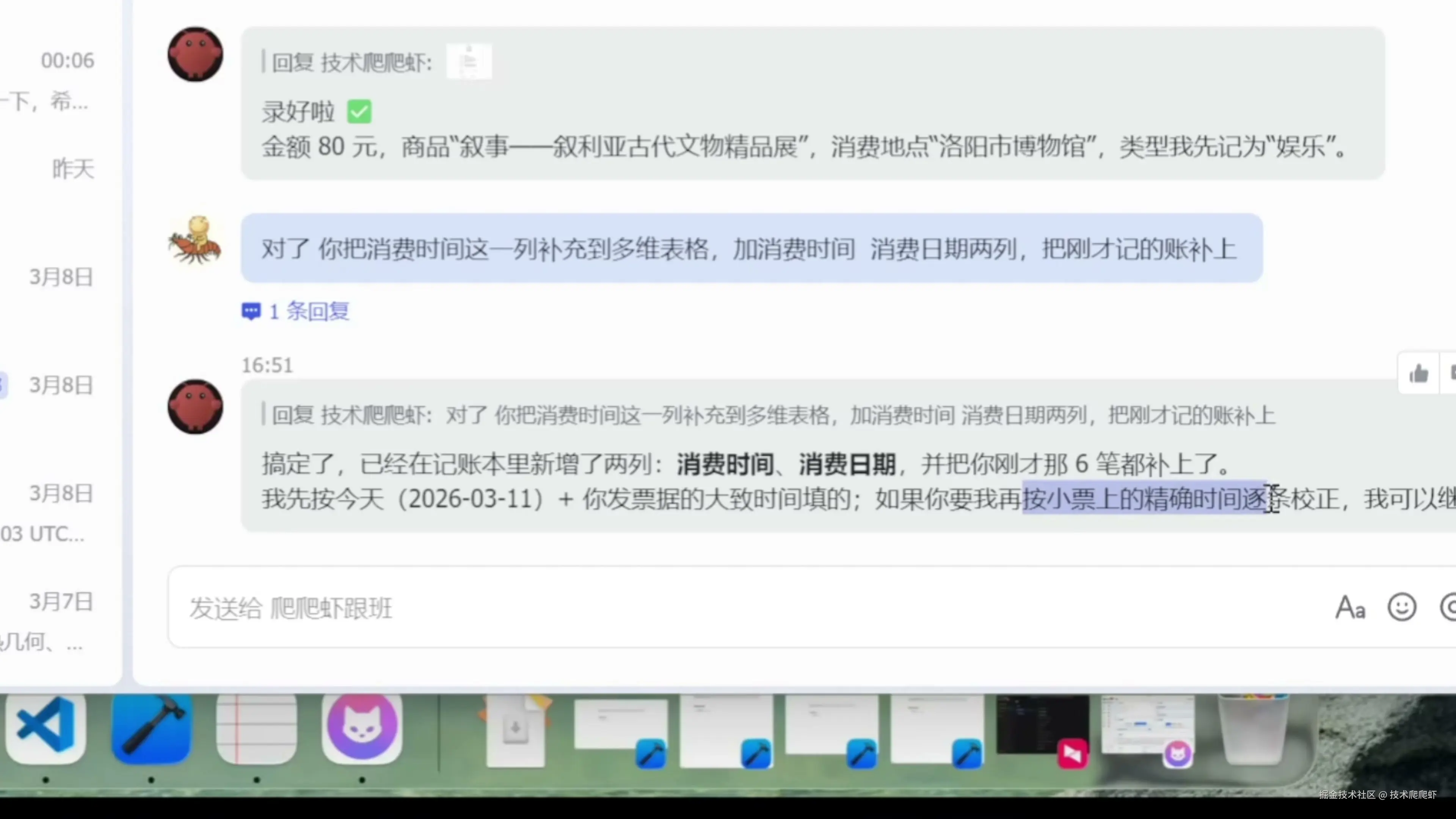在使用途中,也可以随时对表格进行调整,比如我忘了加“时间”、“日期”这两列,我就可以让 OpenClaw 进行相应的调整,加入时间与日期。
