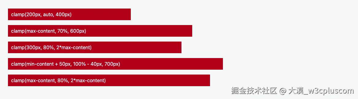 正因为如此,它可以把原本不能参与计算的尺寸关键字,安全地带入 clamp() 的计算逻辑中。利用这种机制,我们可以组合出多种不同的写法,例如: