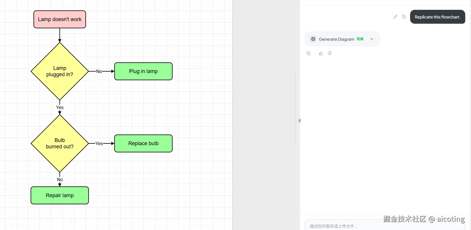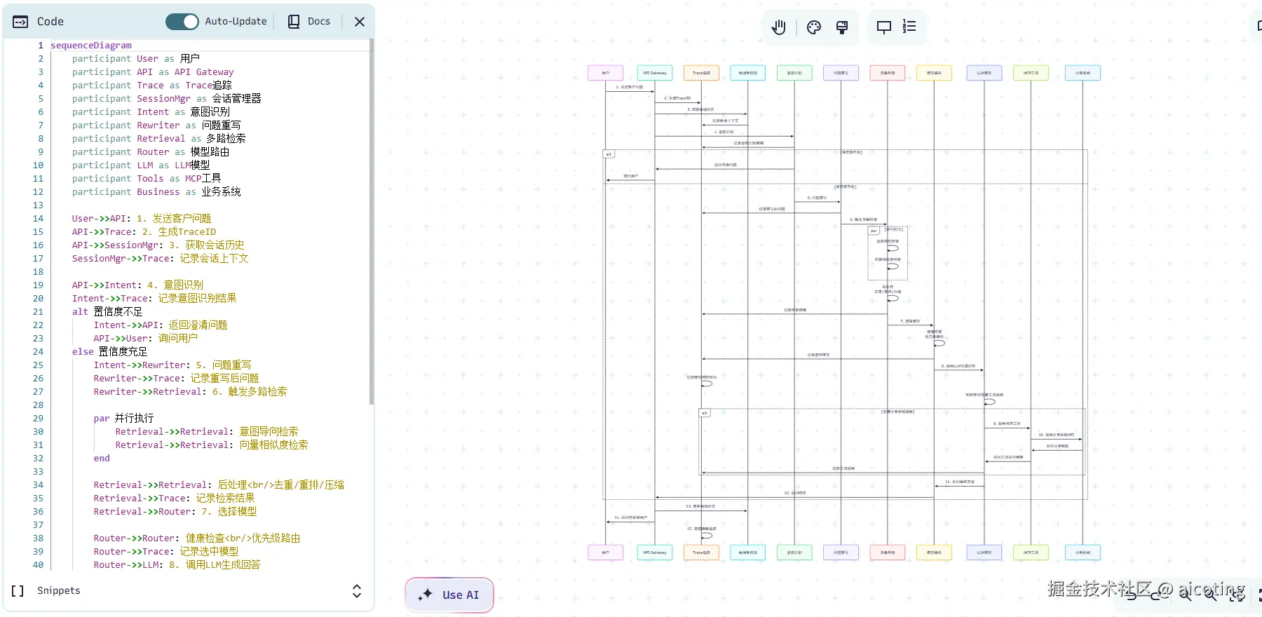 Mermaid Chart 则是在 Mermaid 基础上发展出的可视化平台,它在保留代码绘图优势的同时增加了一些 AI 辅助功能。对于技术写作者来说,这种工具非常适合用于技术文档,因为图表可以直接嵌入 Markdown 文件中,并且随着代码版本管理系统一起维护。虽然 Mermaid 的视觉效果相比设计型工具稍显简单,但在工程实践中,它依然是最稳定和最实用的解决方案之一。