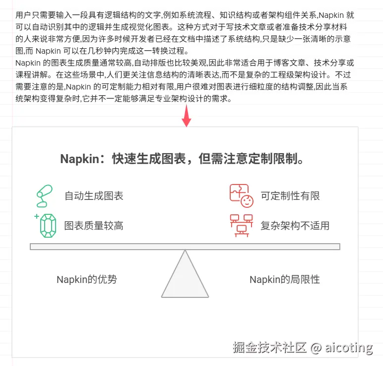 Napkin 的图表生成质量通常较高,自动排版也比较美观,因此非常适合用于博客文章、技术分享或课程讲解。在这些场景中,人们更关注信息结构的清晰表达,而不是复杂的工程级架构设计。不过需要注意的是,Napkin 的可定制能力相对有限,用户很难对图表进行细粒度的结构调整,因此当系统架构变得复杂时,它并不一定能够满足专业架构设计的需求。