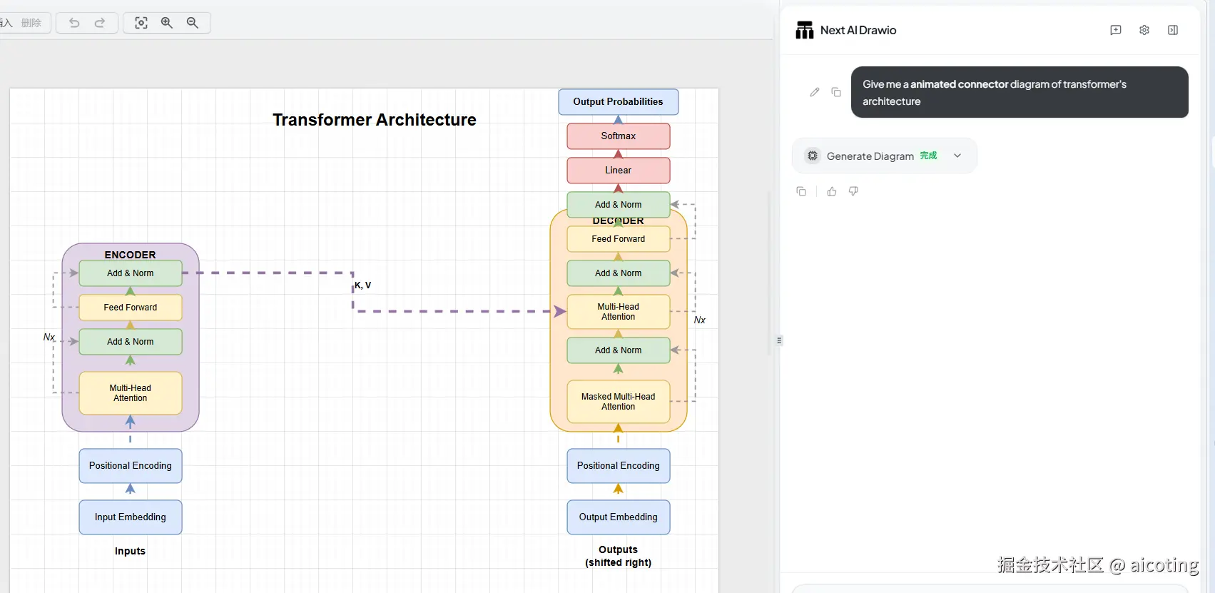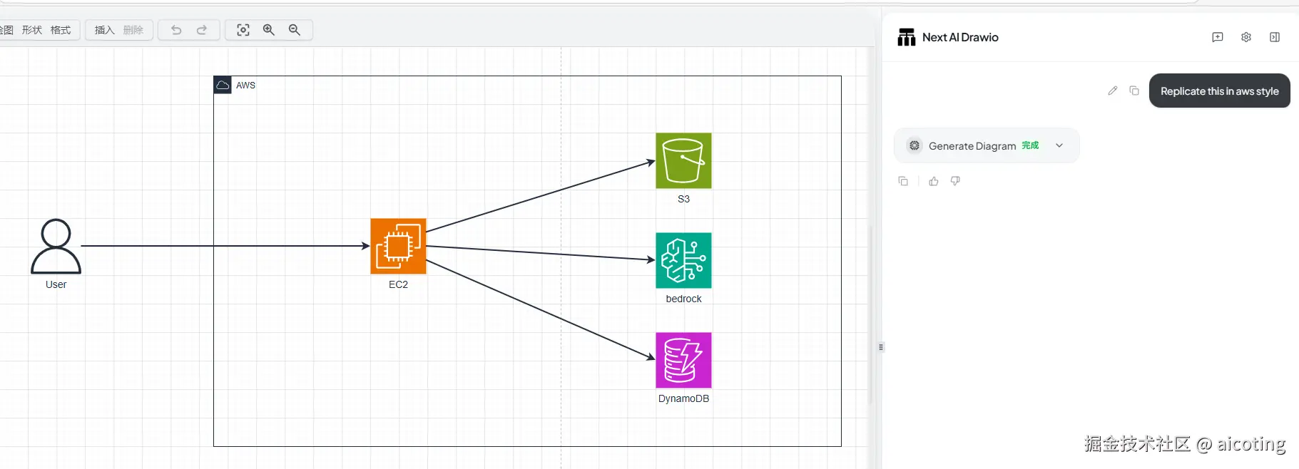 Next AI Drawio 可以理解为传统 draw.io 的 AI 版本,它保留了 draw.io 的强大绘图能力,同时增加了自然语言生成图表的功能。用户可以通过描述系统架构,让 AI 自动生成初始图表,然后再利用 draw.io 的丰富组件进行精细调整。