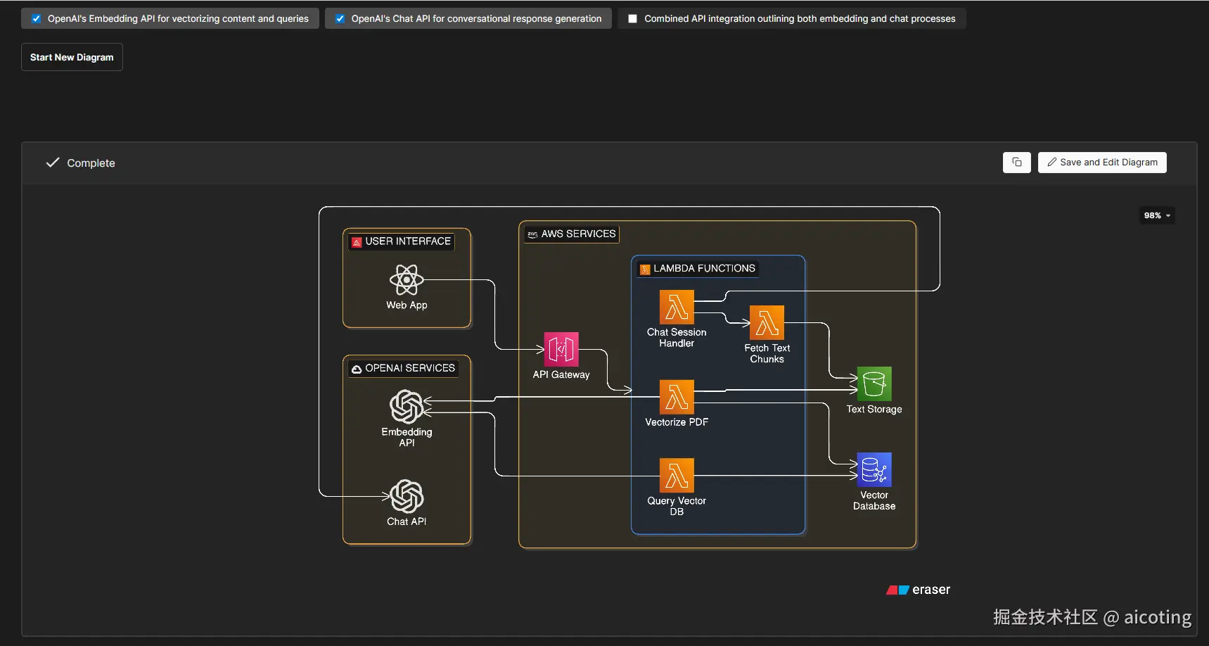 DiagramGPT 是基于Eraser的一种更加直接的 AI 绘图工具,它的核心思路非常简单:用户输入自然语言描述,AI 自动生成系统架构图或流程图。这种方式在快速构思系统结构时非常有价值,因为开发者只需要用语言描述系统组件关系,工具就可以自动生成一个初步的架构草图。