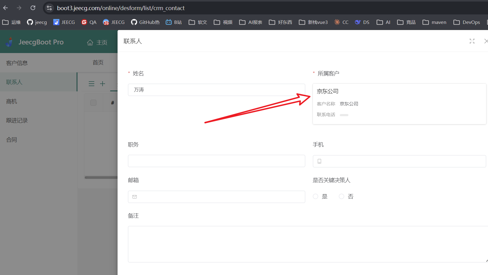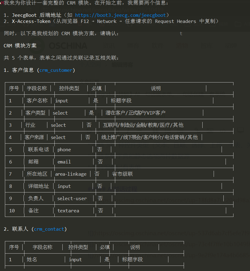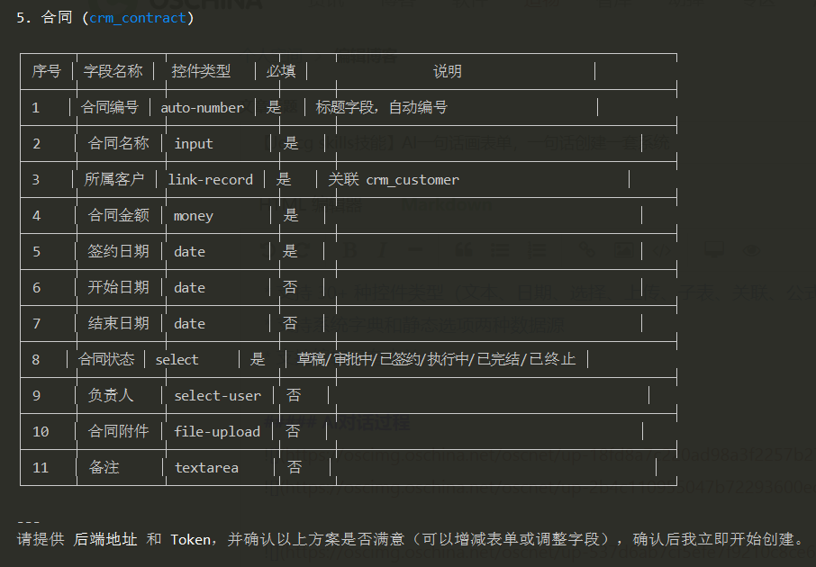 整个过程中,AI 会自动分析 CRM 系统所需的表单结构,推导出客户管理、联系人、商机跟踪等模块所需的字段和控件类型,然后逐一生成并创建: