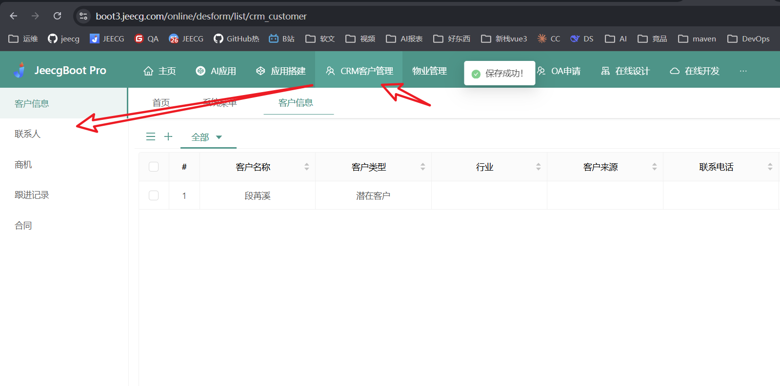 将表单部署到 JeecgBoot低代码系统后,直接就能在前端页面中看到完整的业务模块: