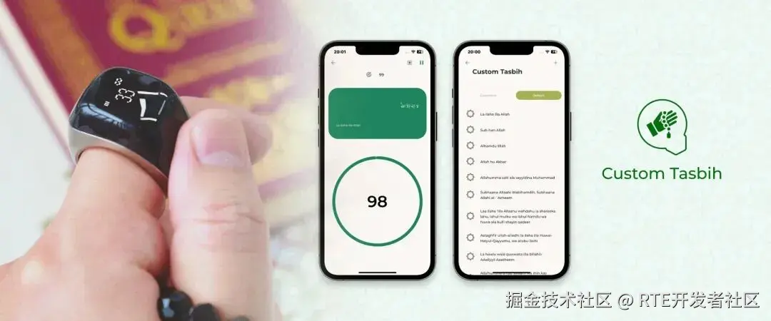 传统的计数方式往往依赖物理念珠或机械计数器,难以记录复杂的修行计划。Custom Tasbih 功能允许用户在 App 中根据个人或导师的建议,灵活设定不同经文的计数目标,当用户通过戒指上的物理按键完成预设目标时,硬件会通过特定的震动频率进行反馈。这种逻辑将模糊的修行转化为精确的进度管理,让每一次按压都成为可感知的精神积累。