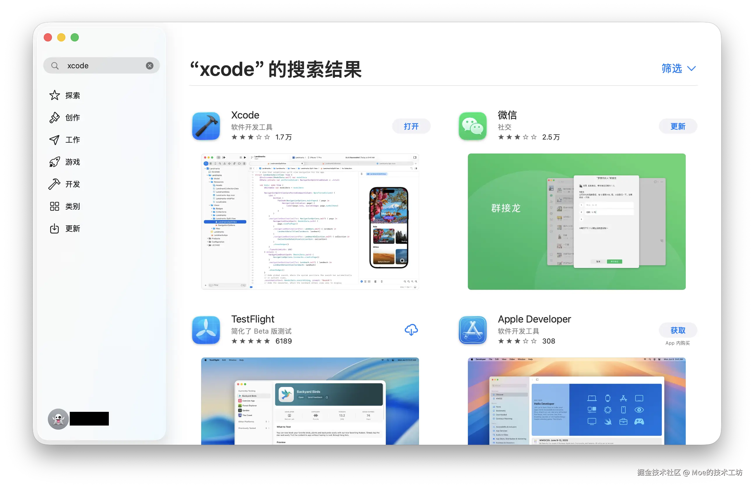 MacOS 安装 Xcode 非常简单,可以选择 App Store。直接搜索 Xcode,点击安装,即可开始自动安装。