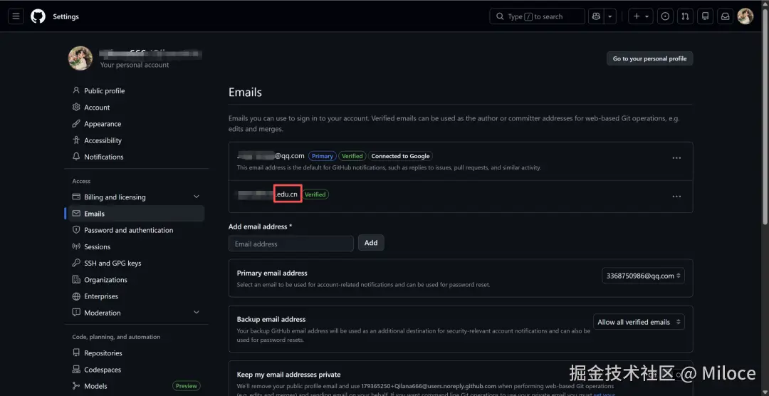 如果你注册 GitHub 用的不是学校邮箱,需要先把学校邮箱添加进去: