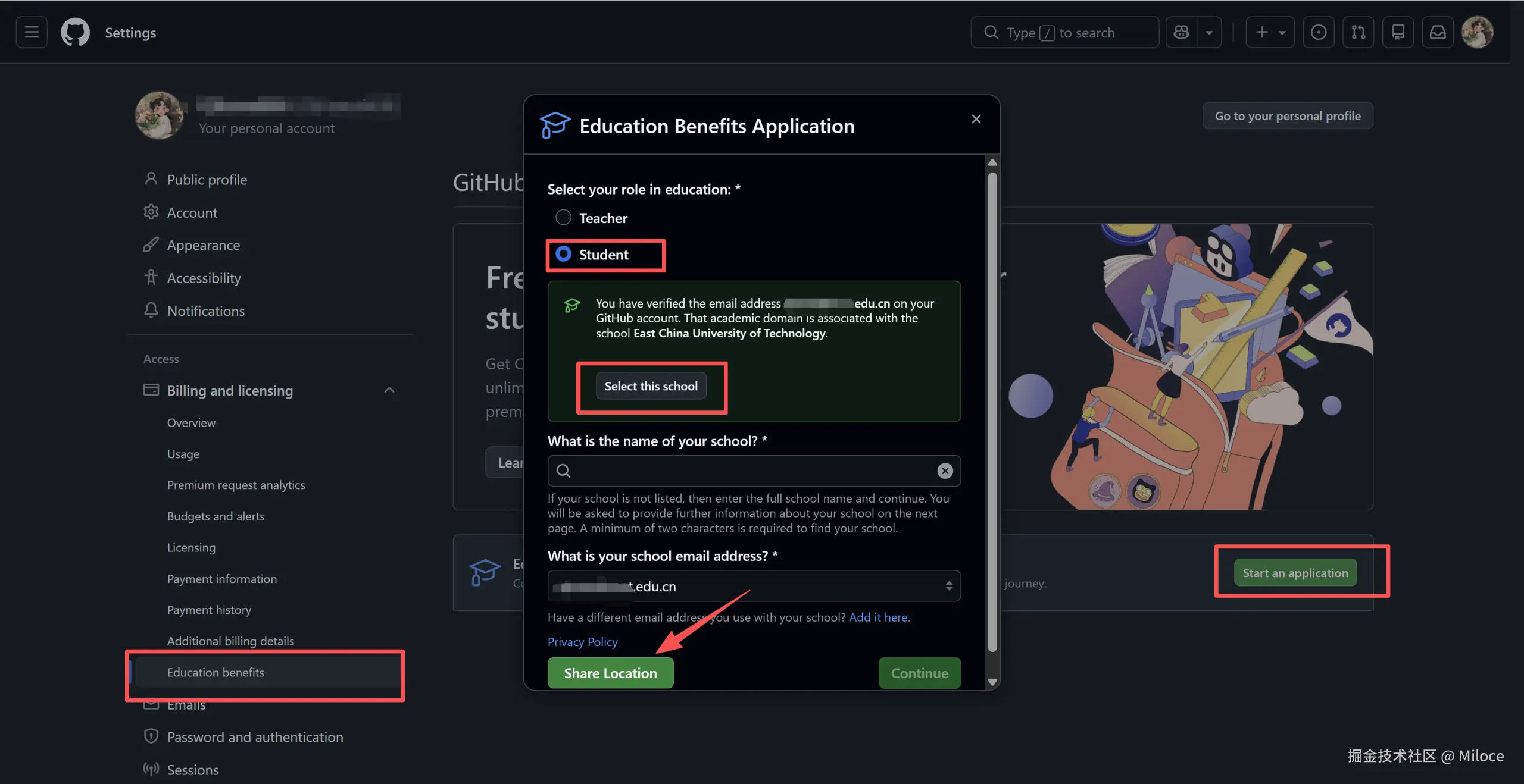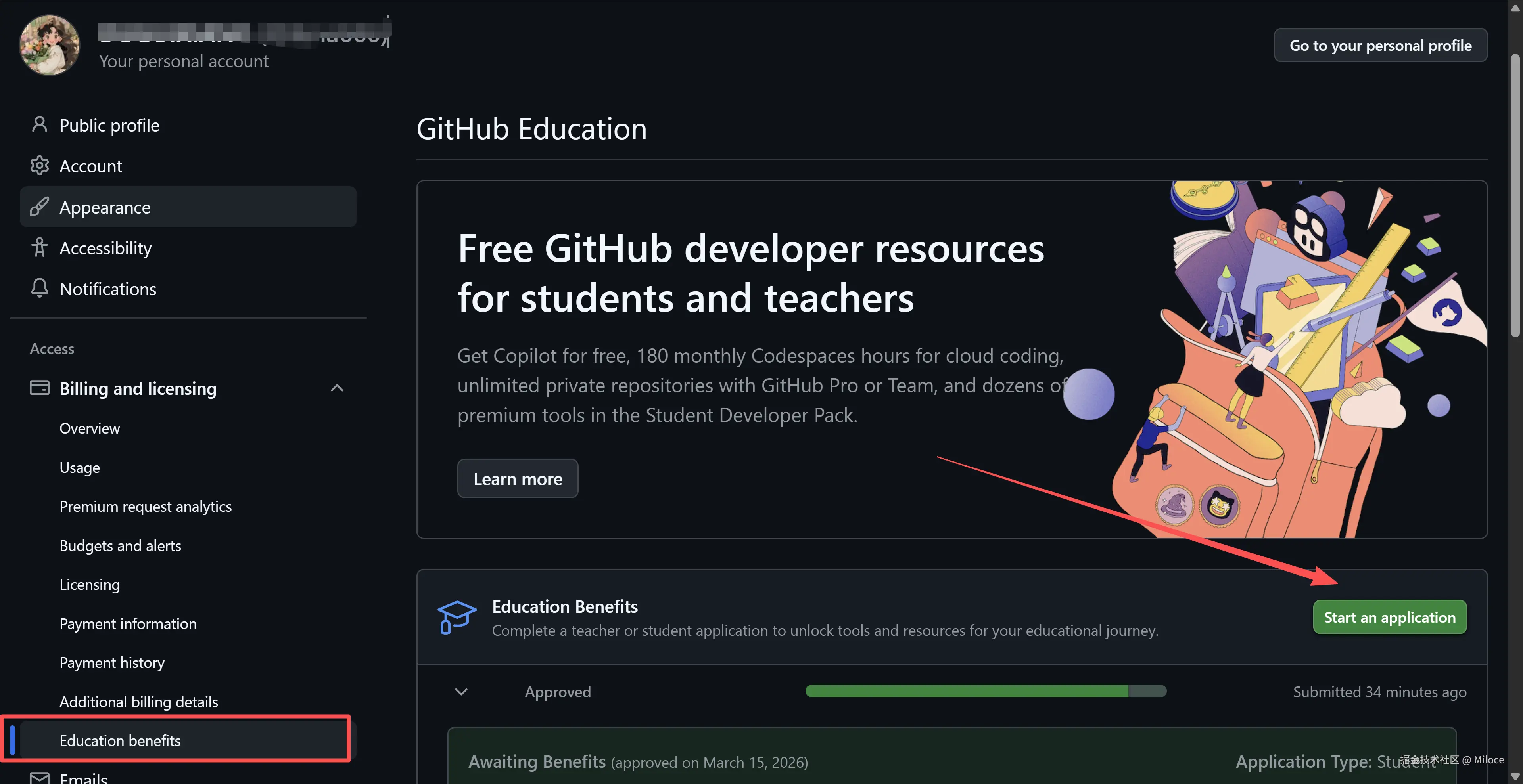找到「GitHub Education」板块,点击 Start an application。