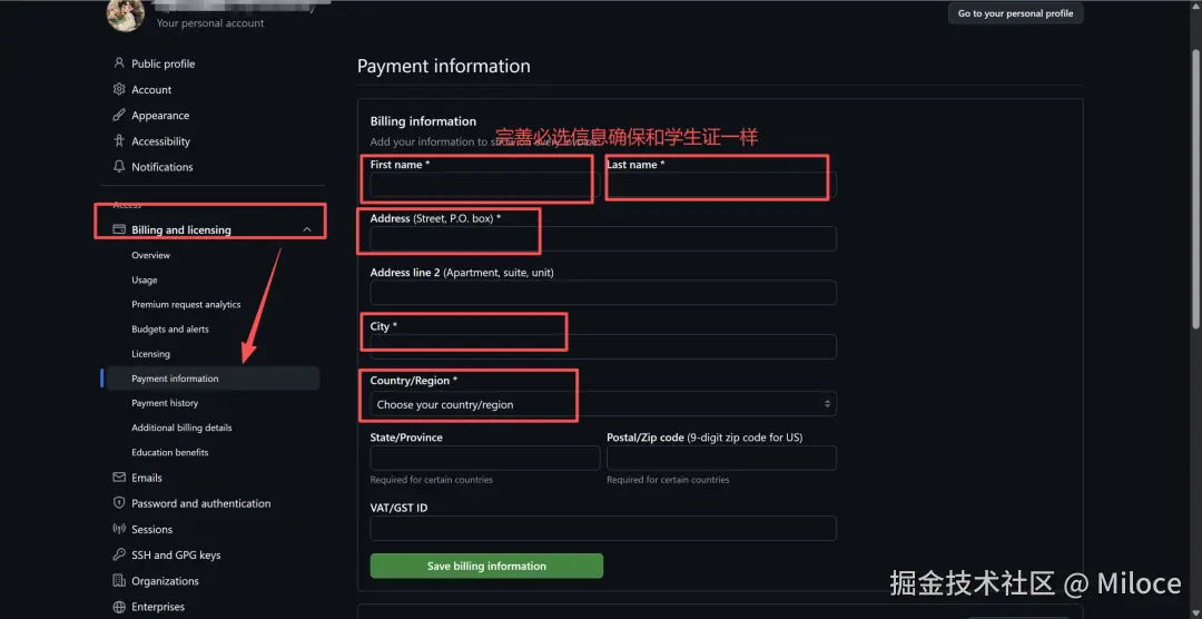 另外建议顺便把 Billing and plans → Payment information 里的姓名和地址也补全,保持和学生证一致。(同样使用大写拼音)