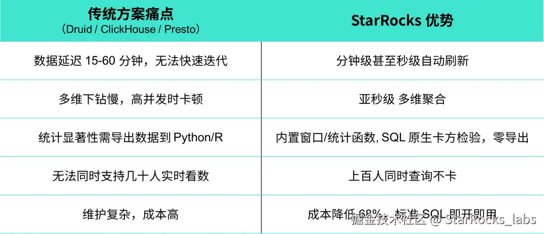 传统方案要导出数据 → 用 Python/R 跑卡方 → 等半天 → 经常错过最佳决策窗口。StarRocks 支持将 SQL 一键计算,亚秒级出结果,物化视图每分钟自动刷新。