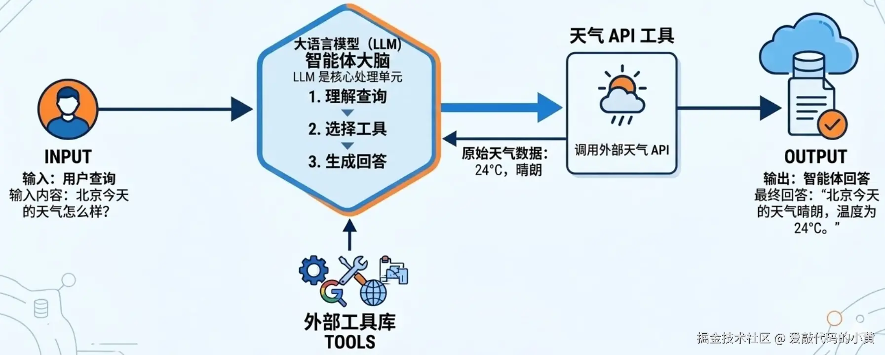 - 查询天气 → 调用