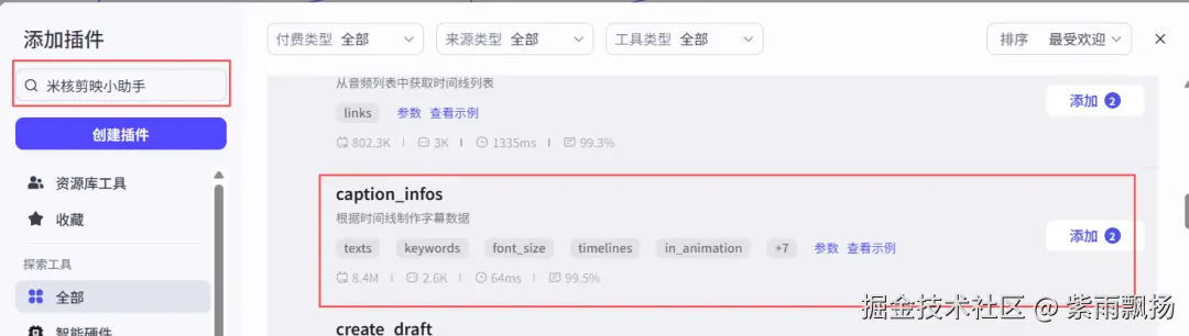 (25)创建剪映草稿该节点的作用是创建剪映草稿 在添加插件中找到米核剪映小助手->添加一个create_draft节点->重命名为创建剪映草稿->设置参数;