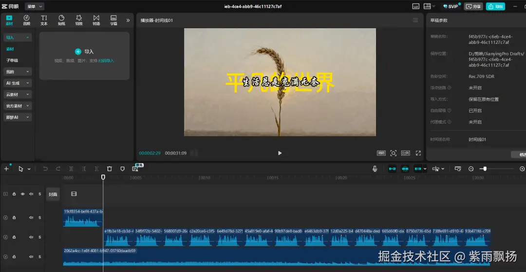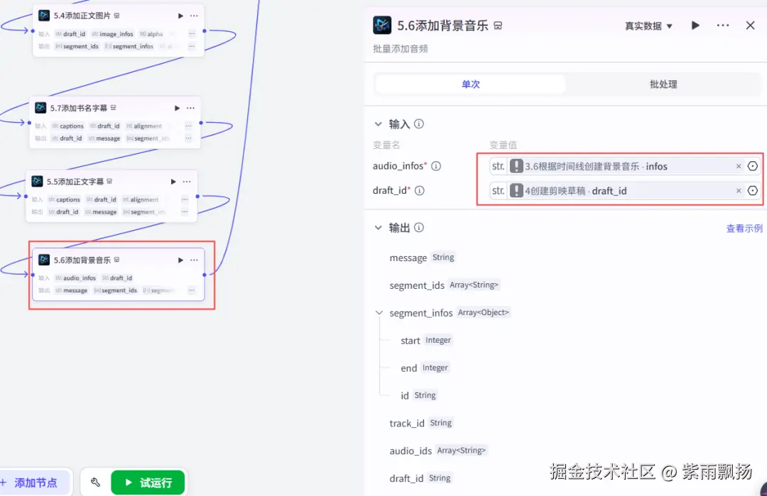 (1)输入书名(bookname):平凡的世界,上传背景音乐(bgm)和开场图片(kc_image),点击试运行,会得到一个草稿ID;(2)将草稿ID输入剪映小助手,点击创建剪映草稿;