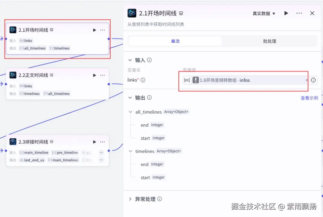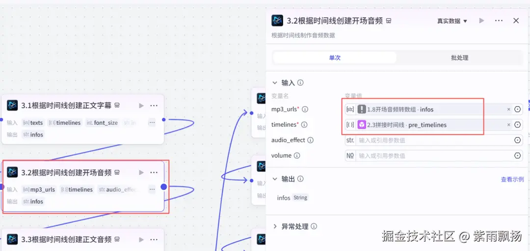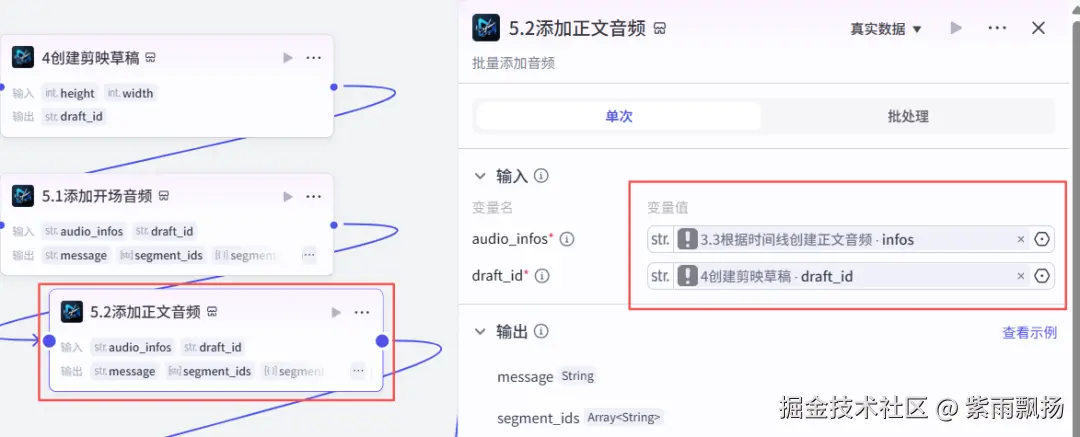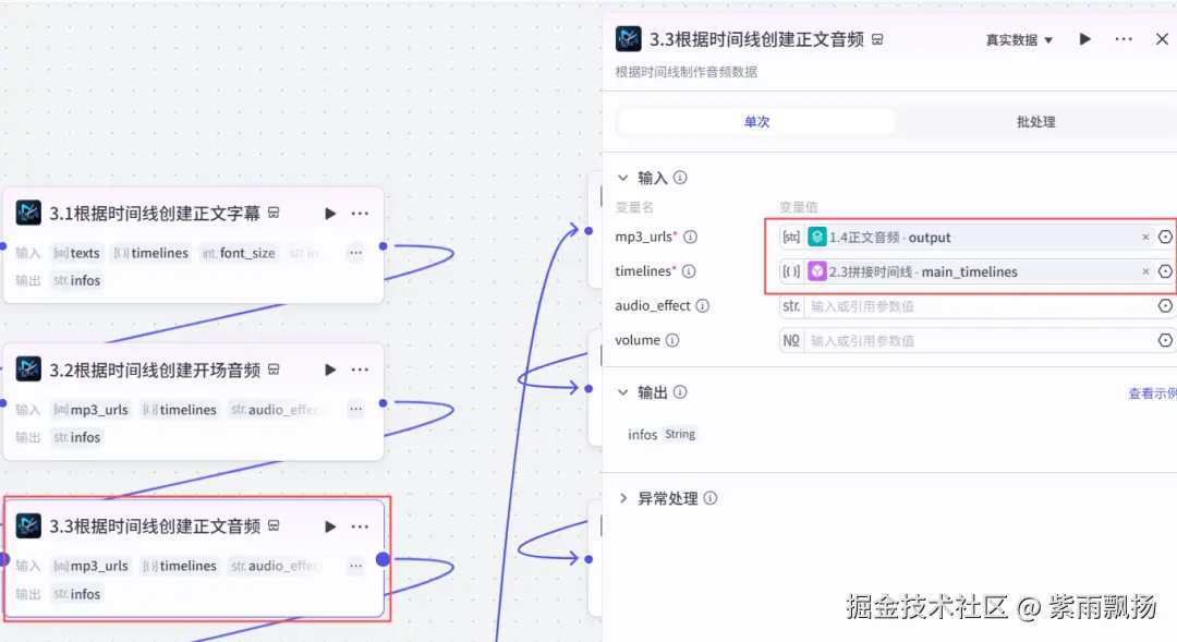 (20)根据时间线创建正文音频 该节点的作用是根据时间线创建正文音频 在添加插件中找到米核剪映小助手->添加一个audio_infos节点->重命名为根据时间线创建正文音频->设置参数; 本节点的插件,同(19)步插件,请参考上步