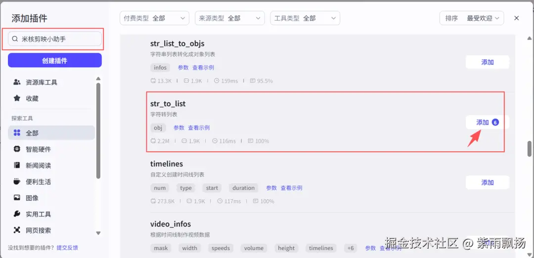 (11)开场图片转数组该节点的作用是对开场图片转换数组格式,方便后面调用在添加插件中找到米核剪映小助手->添加一个str_to_list节点->重命名为开场图片转数组->设置参数;