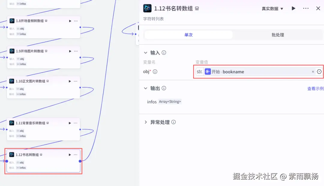 (14)书名转数组该节点的作用是对书名转换数组格式,方便后面调用 在添加插件中找到米核剪映小助手->添加一个str_to_list节点->重命名为书名转数组->设置参数;