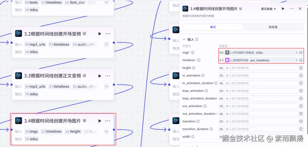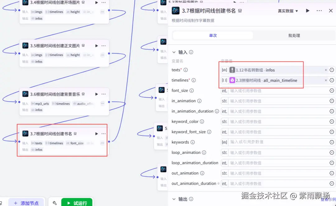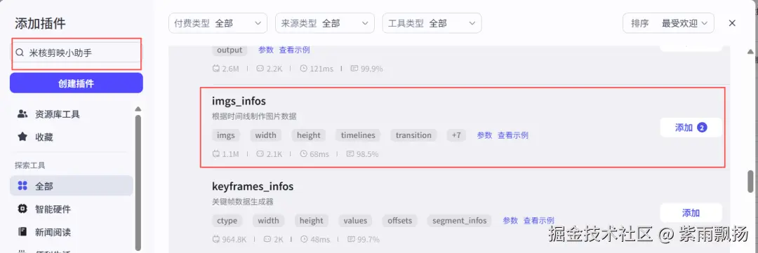 (22)根据时间线创建正文图片 该节点的作用是根据时间线创建正文图片 在添加插件中找到米核剪映小助手->添加一个imgs_infos节点->重命名为根据时间线创建正文图片->设置参数; 本节点的插件,同(21)步插件,请参考上步